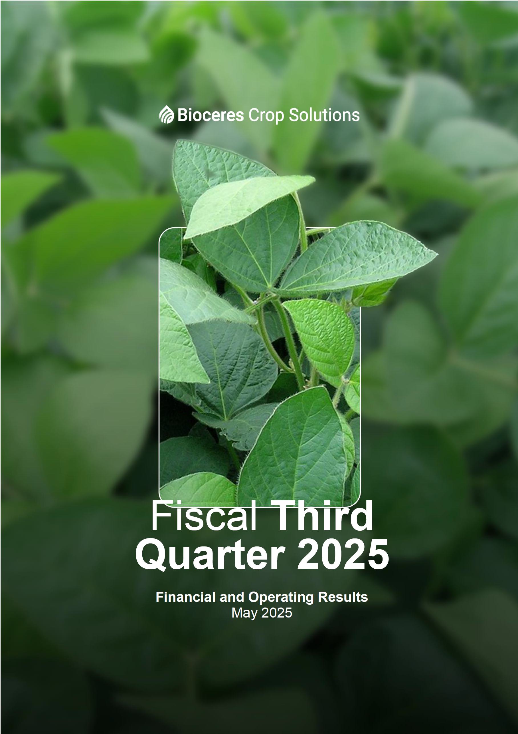 阿根廷罗萨里奥– 2025年5月21日– Bioceres Crop解决方案公司(Bioceres)(纳斯达克股票代码:BIOX)是生产力解决方案开发和商业化的领导者,该解决方案旨在让农业生态系统再生,同时使作物对气候变化具有更强的抵御能力,该公司公布了截至2025年3月31日的第三财季财务业绩。财务业绩以美元表示,并按照国际财务报告准则列报。除非另有说明,本公告中的所有比较均为同比(YoY)。