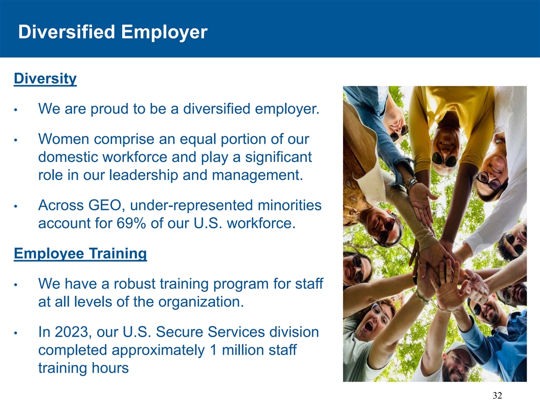 多元化雇主多元化•我们为成为多元化雇主而自豪。•妇女在我们的国内劳动力中占同等的比例,在我们的领导和管理中发挥着重要作用。•在整个GEO中,代表性不足的少数族裔占我们美国劳动力的69%。员工培训•我们为组织各级员工制定了强有力的培训计划。• 2023年,我们的美国安全服务部门完成了大约100万个员工培训小时32