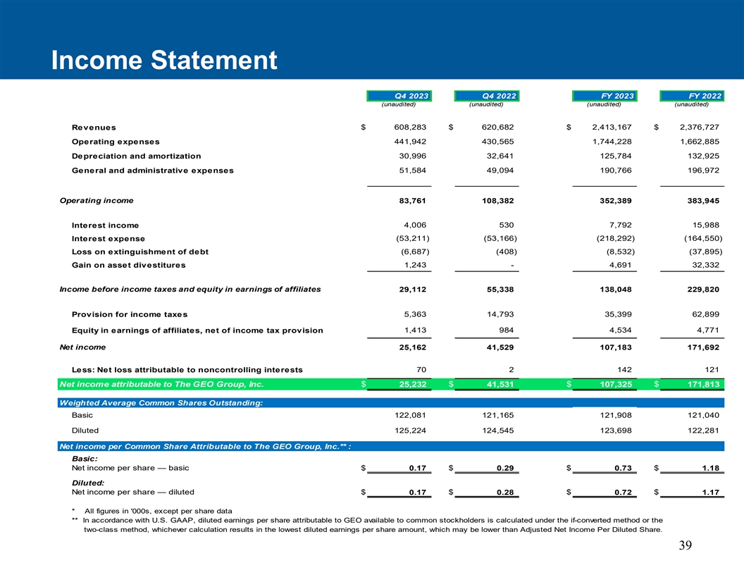 损益表Q4 2023 Q4 2022 FY 2022 FY 2022(unaudited)(unaudited)FY 2022(unaudited)(unaudited)(unaudited)Revenues $ 608,283 $ 620,682 $ 2,413,167 $ 2,376,727441,942430,5651,744,2281,662,885 Operating expenses depreciation and amortization 30,99632,641125,784132,925 General and administrative expenses 51,58449,094190,766 196,972 Operating income 83,761108,382352,389383,9454,0 065307,79附属公司收益中的权益29,11255,338138,048229,8205,36314,79335,39962,899所得税拨备附属公司收益中的权益,扣除所得税拨备1,4139844,5344,771净收益25,16241,529107,183171,692减:归属于非控股权益的净亏损702142121归属于GEO惩教集团,Inc.的净利润25,232美元41,531美元107,325美元171,813美元加权平均已发行普通股:基本122,081121,165121,908121,040摊薄后125,224124,545123,698122,281归属于GEO惩教集团的每股普通股净收益,Inc. * *:基本:每股净收益—基本0.17美元0.29美元0.73美元1.18美元稀释后:每股净收益—稀释后0.17美元0.28美元0.72美元1.17美元* 2000年所有数据,但每股数据除外* *按照美国公认会计原则,普通股股东可获得的归属于GEO的稀释后每股收益是根据IF-转换法或二分类法计算的,无论哪种计算结果导致最低稀释后每股收益金额,可能低于调整后的稀释后每股净收益。39