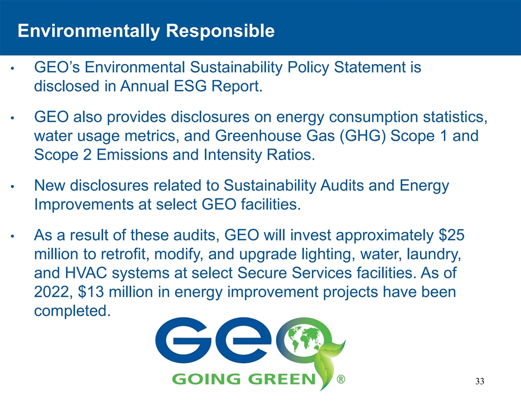 环境责任• GEO的环境可持续性政策声明在年度ESG报告中披露。• GEO还披露了能源消费统计数据、用水量指标以及温室气体(GHG)范围1和范围2的排放量和强度比。•与特定GEO设施的可持续性审计和能源改进相关的新披露。•作为这些审计的结果,GEO将投资约2500万美元,对选定的安全服务设施的照明、供水、洗衣和暖通空调系统进行改造、修改和升级。截至2022年,已完成1300万美元的能源改善项目。33