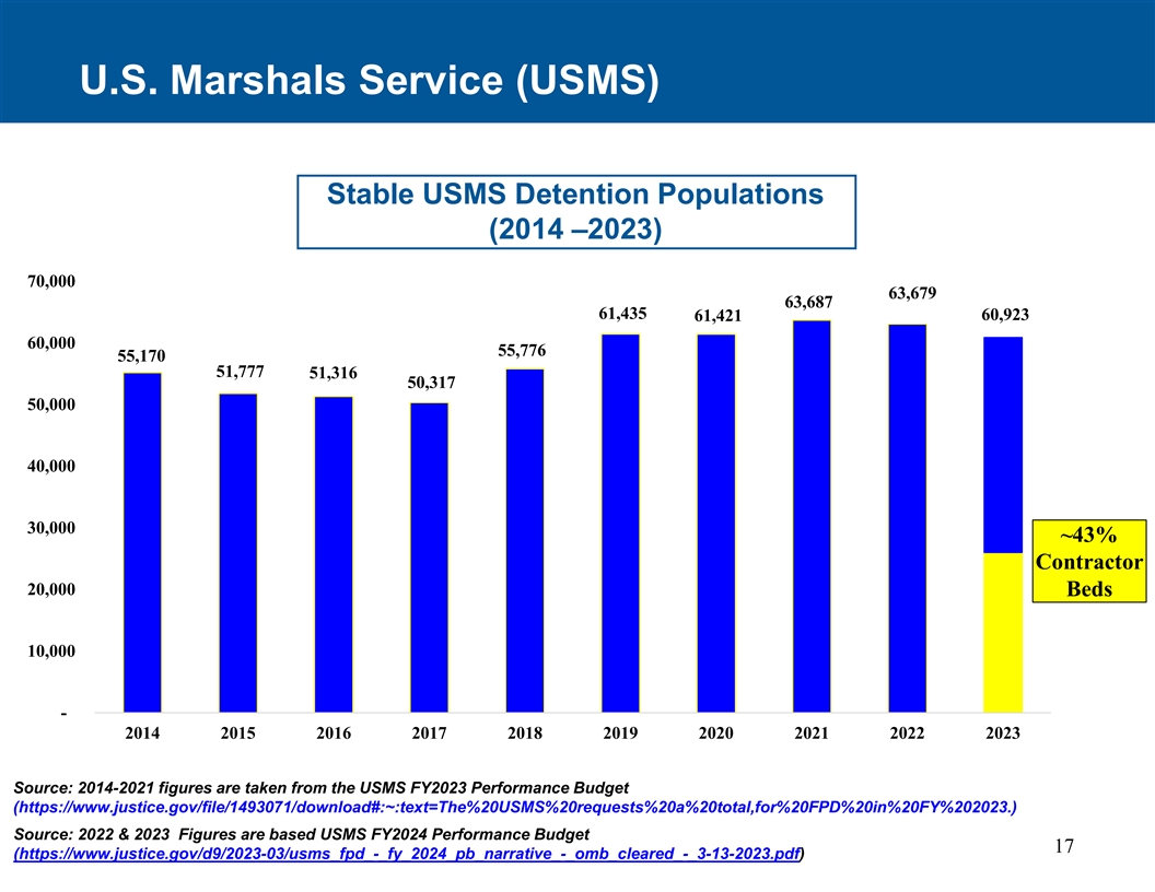 美国法警服务(USMS)稳定的USMS拘留人口(2014 – 2023)70,00063,67963,68761,43560,92361,42160,00055,77655,17051,77751,31650,31750,00040,00030,000~43%承包商20,000床位10,000-2014201520162017201820192020202120222023来源:2014-2021数据取自USMS FY2023绩效预算(https://www.justice.gov/file/1493071/download#:~:text=the%20USMS % 20requests%20a%20total,for % 20FPD % 20in % 20FY % 202023。)来源:2022 & 2023数据基于USMS FY2024绩效预算17(