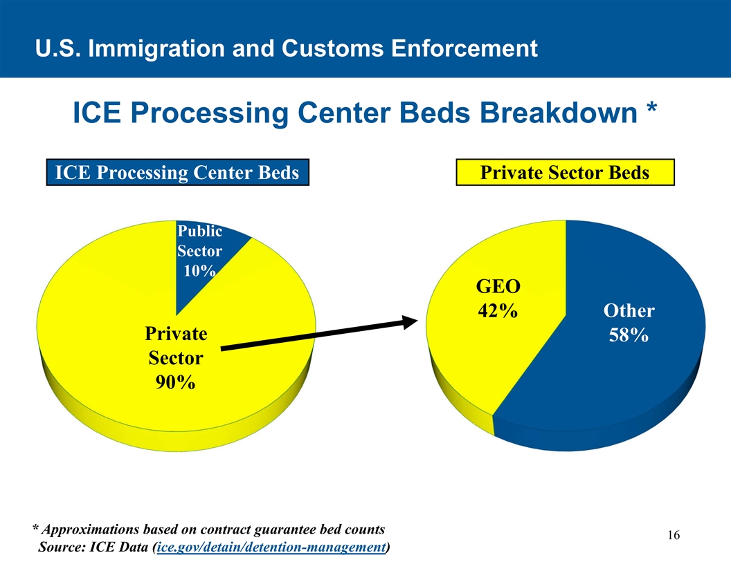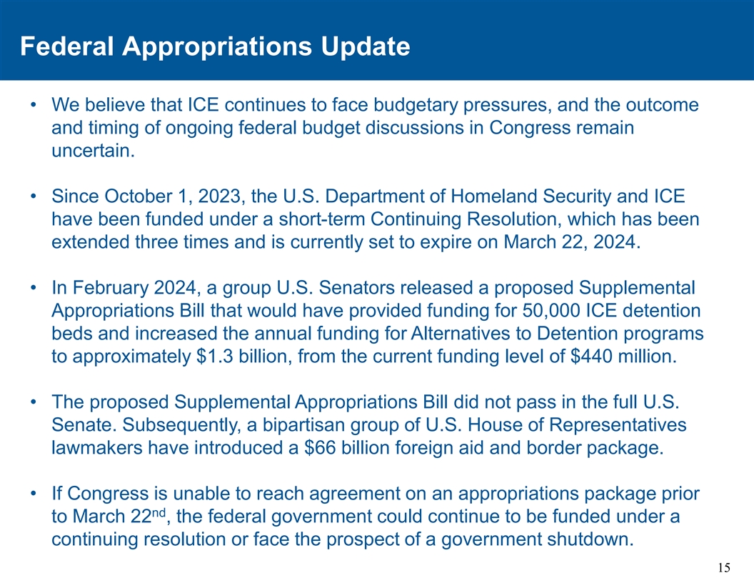 联邦拨款更新•我们认为ICE继续面临预算压力,国会正在进行的联邦预算讨论的结果和时间仍然不确定。•自2023年10月1日起,美国国土安全部和ICE根据一项短期持续决议获得资金,该决议已被延长三次,目前定于2024年3月22日到期。• 2024年2月,一组美国参议员发布了一项拟议的补充拨款法案,该法案将为5万张ICE拘留床位提供资金,并将替代拘留计划的年度资金从目前的4.4亿美元的资金水平增加到约13亿美元。•拟议的补充拨款法案未在美国参议院全体通过。随后,一个由美国众议院议员组成的两党团体推出了一项660亿美元的外援和边境一揽子计划。•如果国会无法在3月22日之前就拨款方案达成一致,联邦政府可能会继续根据一项持续的决议获得资金,否则将面临政府关门的前景。15