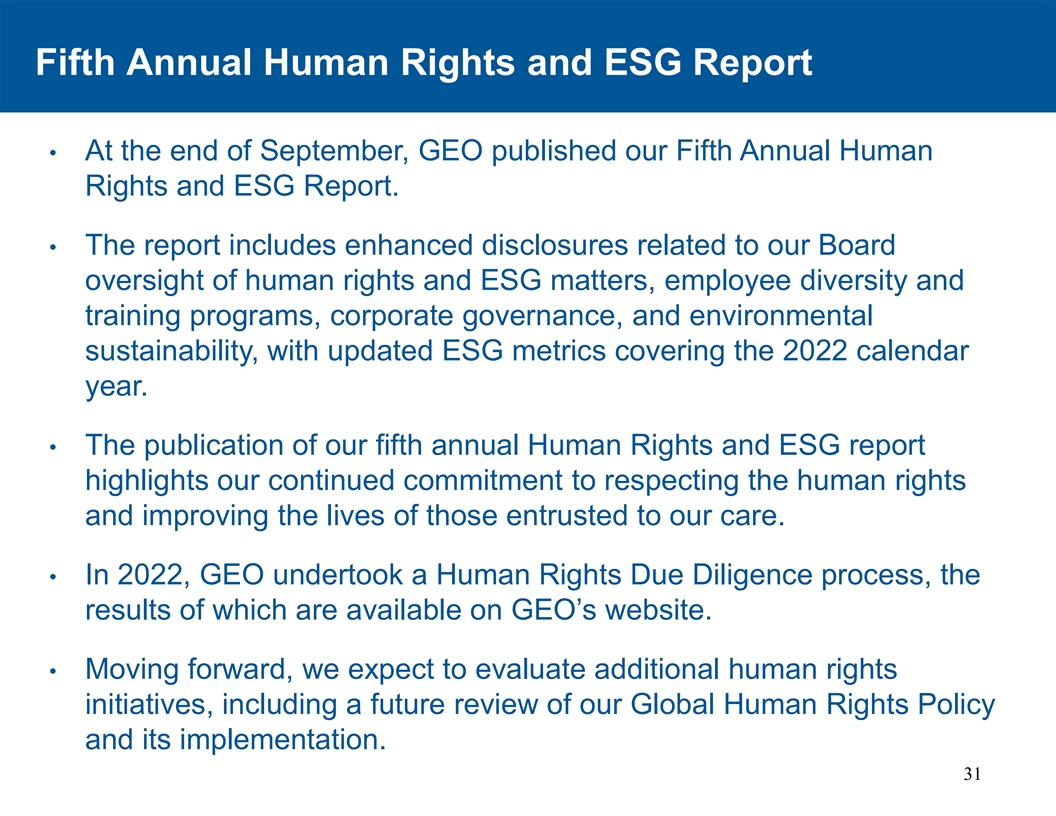 第五次年度人权与ESG报告9月底,GEO发布了我们的第五次年度人权•权利与ESG报告。•该报告包括与我们的董事会对人权和ESG事项的监督、员工多样性和培训计划、公司治理和环境可持续性相关的强化披露,更新的ESG指标涵盖2022日历年。•我们第五次年度人权和ESG报告的发布,凸显了我们对尊重人权和改善受托照顾的人的生活的持续承诺。2022年,GEO开展了人权尽职调查程序,其•结果可在GEO网站上查阅。•展望未来,我们预计将评估更多的人权倡议,包括未来对我们的全球人权政策及其实施情况进行审查。31