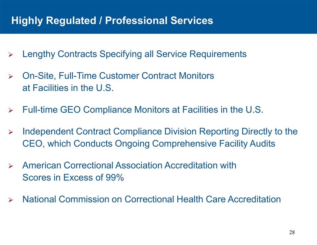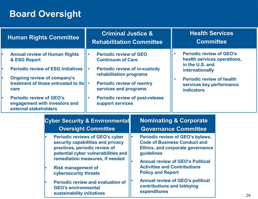 高度监管/专业服务Ø详细规定所有服务要求的长合同Ø美国设施的现场、全职客户合同监控器Ø美国设施的全职GEO合规监控器Ø独立的合同合规部门直接向CEO报告,CEO进行持续的综合设施审计Ø美国惩教协会认证,评分超过99% Ø国家惩教保健认证委员会28