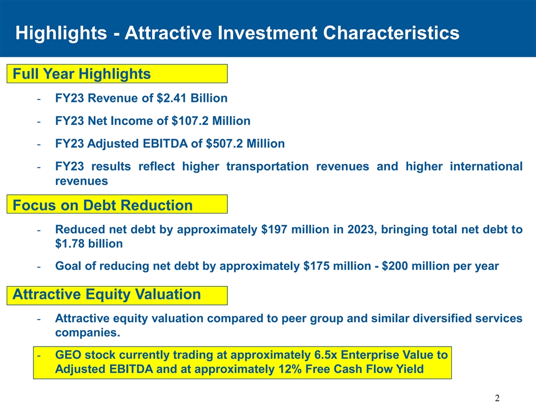 亮点-有吸引力的投资特征全年亮点-23财年收入24.1亿美元-23财年净收入1.072亿美元-23财年调整后EBITDA为5.072亿美元-23财年业绩反映了更高的运输收入和更高的国际收入关注减债-2023年净债务减少约1.97亿美元,使净债务总额达到17.8亿美元-目标每年减少约1.75亿美元-2亿美元有吸引力的股权估值-与同行集团和类似的多元化服务公司相比,股权估值有吸引力。-GEO股票目前的交易价格约为企业价值与调整后EBITDA的6.5倍,自由现金流收益率约为12% 2
