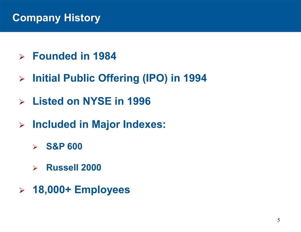 公司历史Ø成立于1984年Ø 1994年首次公开发行股票(IPO),1996年在纽交所上市丨Ø纳入主要指数:Ø 标普 600 Ø罗素2000 Ø 18,000 +员工5