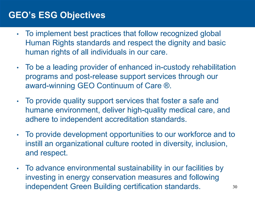 GEO的ESG目标•实施遵循公认的全球人权标准的最佳做法,尊重我们照顾的所有个人的尊严和基本人权。•通过我们屡获殊荣的GEO Continuum of Care ®,成为增强的在押康复计划和释放后支持服务的领先供应商。•提供培育安全人文环境、提供优质医疗服务、坚持自主认证标准的优质支撑服务。•为我们的员工提供发展机会,并灌输植根于多样性、包容性和尊重的组织文化。•通过投资节能措施和遵循30项独立的绿色建筑认证标准,推动我们设施的环境可持续性。