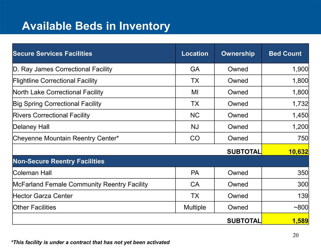 库存中的可用床位安全服务设施位置所有权床位数D. Ray James惩教设施GA拥有1,900个Flightline惩教设施TX拥有1,800个北湖惩教设施MI拥有1,800个Big Spring惩教设施TX拥有1,732个Rivers惩教设施NC拥有1,450个Delaney Hall NJ拥有1,200个Cheyenne Mountain再入中心* CO拥有750个小计10,632个非安全再入设施Coleman Hall PA拥有350个McFarland女性社区再入设施加利福尼亚州拥有300个Hector Garza中心TX拥有139个其他设施多个拥有~800个小计1,58920 *此设施根据合同尚未激活的