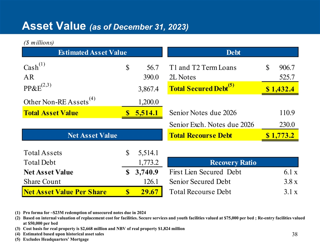 资产价值(截至2023年12月31日)(百万美元)估计资产价值债务(1)现金$ 56.7 T1和T2定期贷款$ 906.7 AR 390.02L票据525.7(2,3)(5)PP & E总担保债务3,867.4 $ 1,432.4(4)其他非可再生能源资产1,200.0 2026年到期的优先票据110.9总资产价值$ 5,514.1优先Exch。2026年到期的票据230.0资产净值总追索权债务$ 1,773.2总资产$ 5,514.1总债务1,773.2回收率第一留置权担保债务6.1 x资产净值$ 3,740.9股数126.1高级担保债务3.8 x每股资产净值$ 29.67总追索权债务3.1 x(1)根据设施重置成本的内部估值赎回2024年到期的约2300万美元无担保票据的备考(2)。每床价值75000美元的安全服务和青年设施;每床价值50000美元的重返设施(3)不动产的成本基础为26.68亿美元,不动产的新业务价值为18.24亿美元(4)根据历史资产销售情况估算38(5)不包括总部的抵押贷款