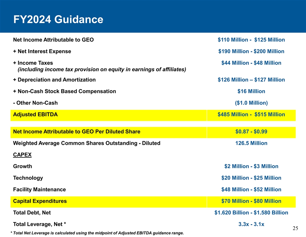 2024财年指引归属于GEO的净利润1.1亿-1.25亿美元+净利息支出1.9亿-2.0亿美元+所得税4400万-4800万美元(包括附属公司收益中的权益所得税拨备)+折旧摊销1.26亿美元– 1.27亿美元+非现金股票薪酬1600万美元-其他非现金(100万美元)调整后EBITDA 4.85亿美元-5.15亿美元每股稀释后GEO应占净收入0.87美元-0.99美元加权平均已发行普通股-稀释后1.265亿资本支出增长200万美元-300万美元技术2000万美元-2500万美元设施维护4800万美元-5200万美元资本支出7000万美元-8000万美元总债务,净16.20亿美元-15.80亿美元总杠杆,净* 3.3x-3.1x 25 *总净杠杆是使用调整后EBITDA指导范围的中点计算得出的。