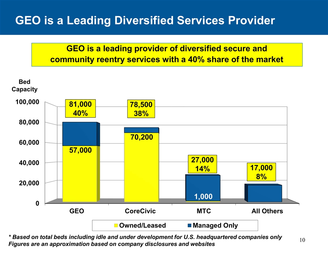 GEO是一家领先的多元化服务提供商GEO是一家领先的多元化安全和社区再入服务提供商,拥有40%的市场份额床位容量100,00081,00078,50040% 38% 80,00070,20060,00057,00027,00040,00017,00014,00014% 8% 20,0001,000 GEO CoreCivic MTC所有其他拥有/租赁管理仅*基于包括美国总部公司闲置和开发中的总床位仅10个数字是基于公司披露和网站的近似