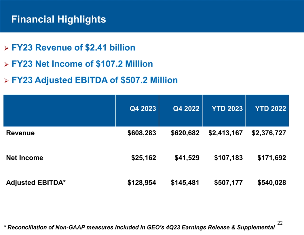 财务摘要Ø FY23收入24.1亿美元Ø FY23净收入1.072亿美元FY23调整后EBITDA为5.072亿美元Ø Q4 2023 Q4 2022 YTD 2023 YTD 2022收入608,283美元620,682美元2,413,167美元2,376,727美元净收入25,162美元41,529美元107,183美元171,692美元调整后EBITDA * 128,954美元145,481美元507,177美元540,02822 * GEO 4Q23收益发布和补充中包含的非公认会计原则措施的调节
