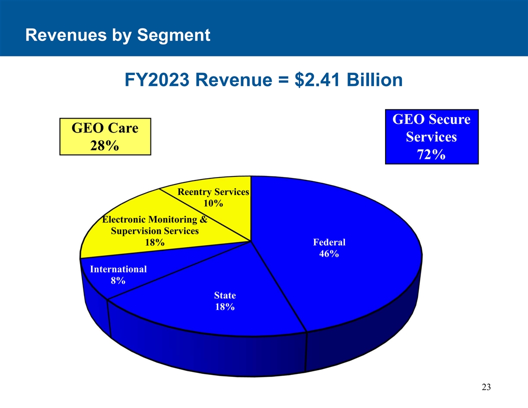 分部收入FY2023收入= 24.1亿美元GEO安全GEO护理服务28% 72%再入服务10%电子监测和监督服务联邦18% 46%国际8%州18% 23