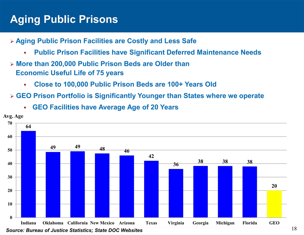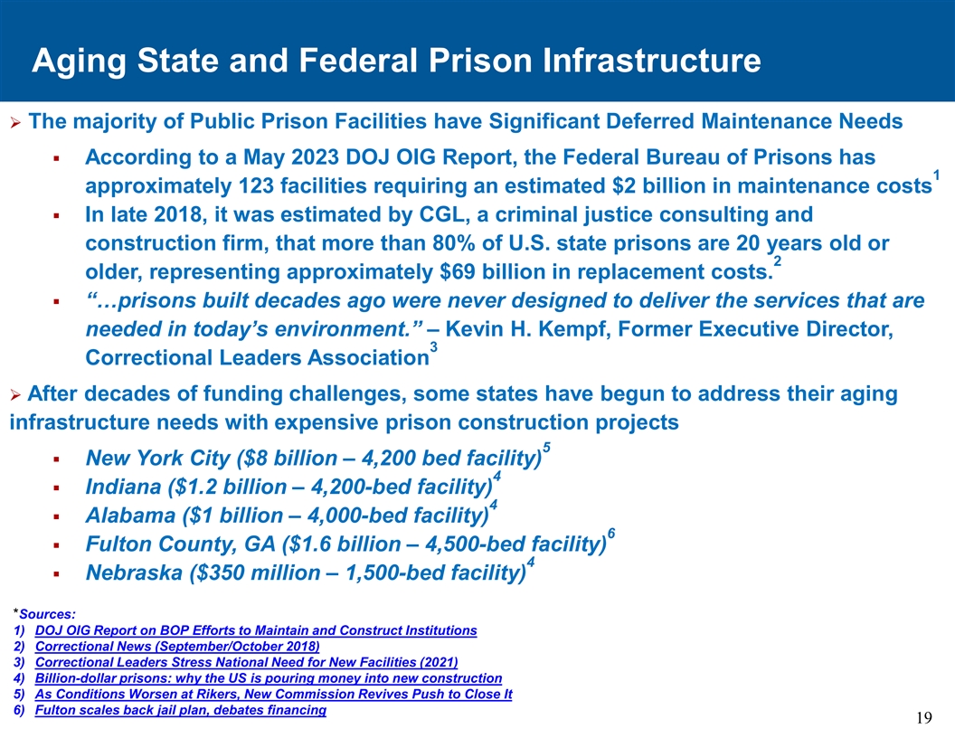 老龄化的公共监狱Ø老龄化的公共监狱设施成本高昂且安全性较低§公共监狱设施存在重大的延期维护需求Ø超过20万张公共监狱床位的使用年限超过了75年的经济使用年限§接近10万张公共监狱床位的使用年限超过100年以上Ø GEO监狱组合明显比我们运营所在的州更年轻§ GEO设施的平均年龄为20岁。年龄7064604949485046423838384036302020100印第安纳州俄克拉何马州加利福尼亚州新墨西哥州亚利桑那州德克萨斯州弗吉尼亚州密歇根州佛罗里达州GEO 18资料来源:司法统计局;州DOC网站