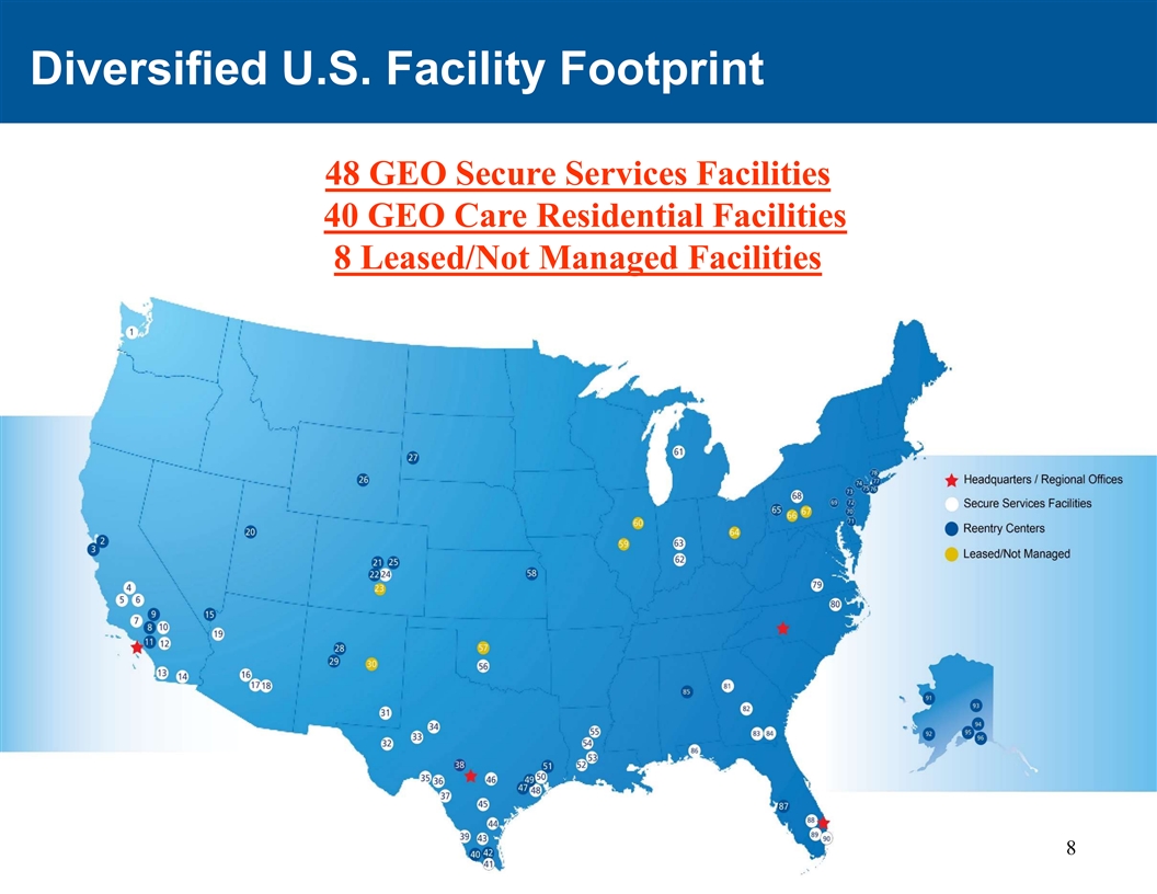 多元化的美国设施足迹48个GEO安全服务设施40个GEO护理住宅设施8个租赁/未管理设施8个