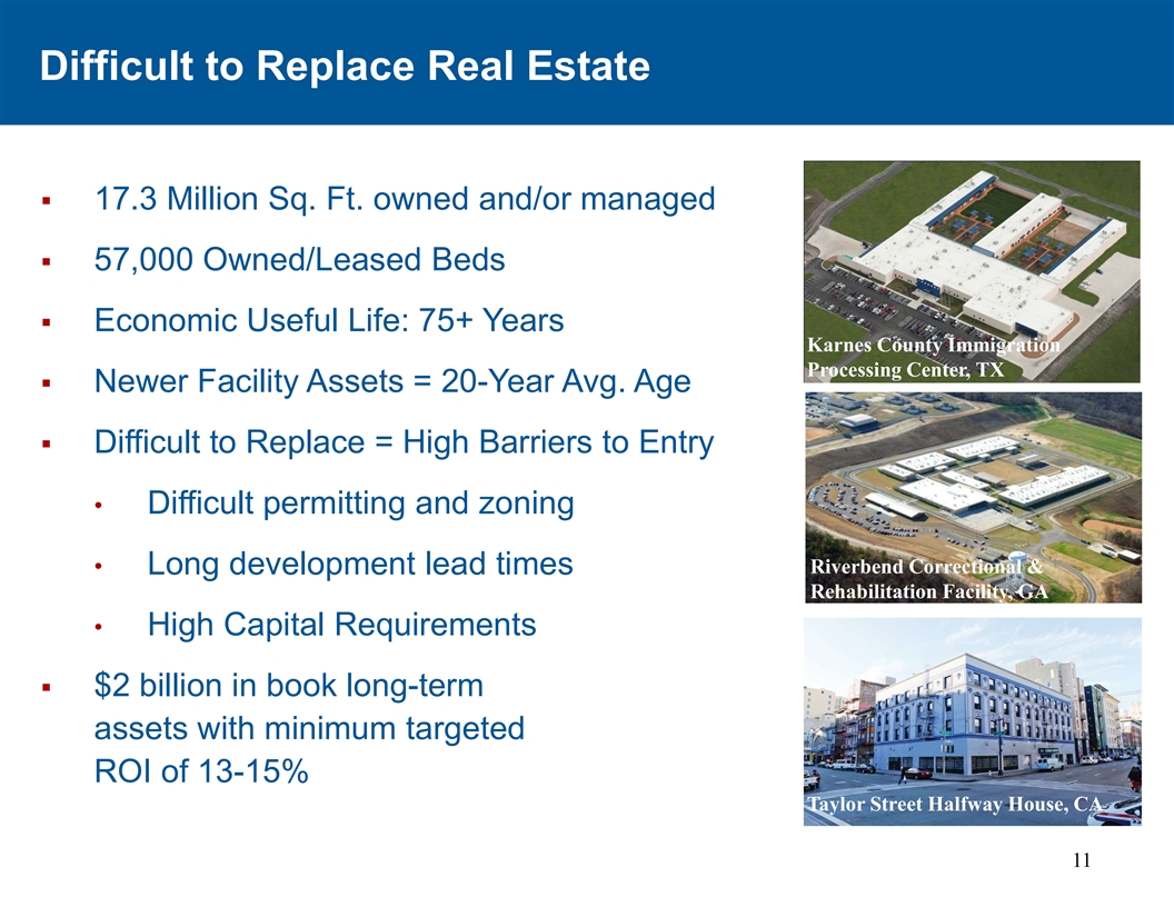 难以替代房地产§ 1730万平方米。FT.拥有和/或管理§ 57,000张拥有/租赁床位§经济实用寿命:75年以上德克萨斯州卡恩斯县移民处理中心§较新的设施资产= 20年平均。年龄§难以取代=高进入壁垒•许可和分区困难Riverbend Correctional & •开发周期长的康复设施,GA •高资本要求§ 20亿美元的账面长期资产,最低目标ROI为13-15 % Taylor Street Halfway House,加利福尼亚州 11