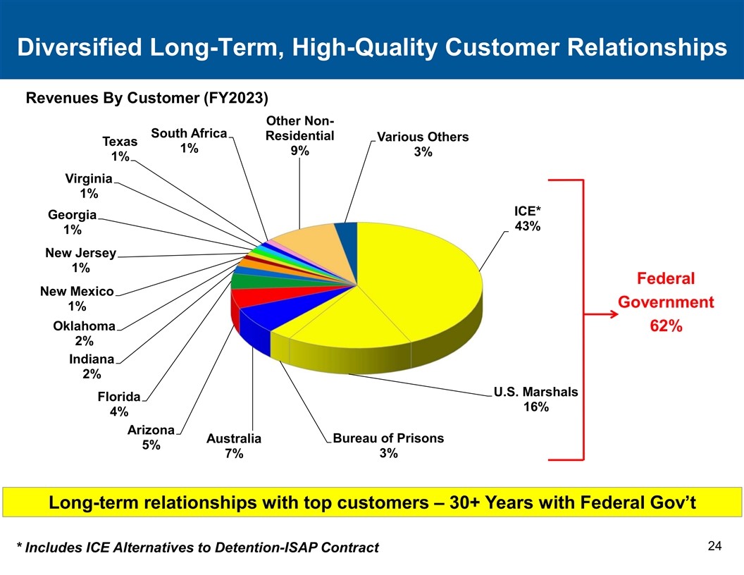 按客户划分的多元化长期、高质量客户关系收入(FY2023)其他非南非住宅各种其他德克萨斯州1% 9% 3% 1%弗吉尼亚州1% ICE *佐治亚州43% 1%新泽西州1%联邦新墨西哥州政府1%俄克拉荷马州62% 2%印第安纳州2%美国法警佛罗里达州16% 4%亚利桑那州澳大利亚监狱局5% 7% 3%与顶级客户的长期关系–与联邦政府24 *的30多年*包括ICE替代拘留-ISAP合同