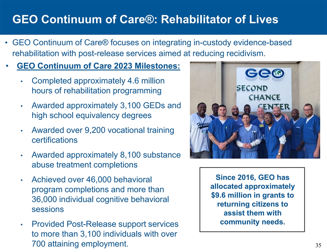 GEO Continuum of Care ®:Life Rehabilitator • GEO Continuum of Care ®专注于将在押循证康复与旨在减少累犯的释放后服务相结合。• GEO Continuum of Care 2023里程碑:•完成约460万小时的康复规划•授予约3100个GED和高中同等学历学位•授予超过9200个职业培训认证•自2016年以来授予约8100个药物滥用治疗完成,GEO •实现了超过46,000个行为分配的约项目完成和超过960万美元的赠款,用于36000名个人认知行为回归公民的课程,以帮助他们满足社区需求。•为3100多人提供释放后支持服务,700多人实现就业。35