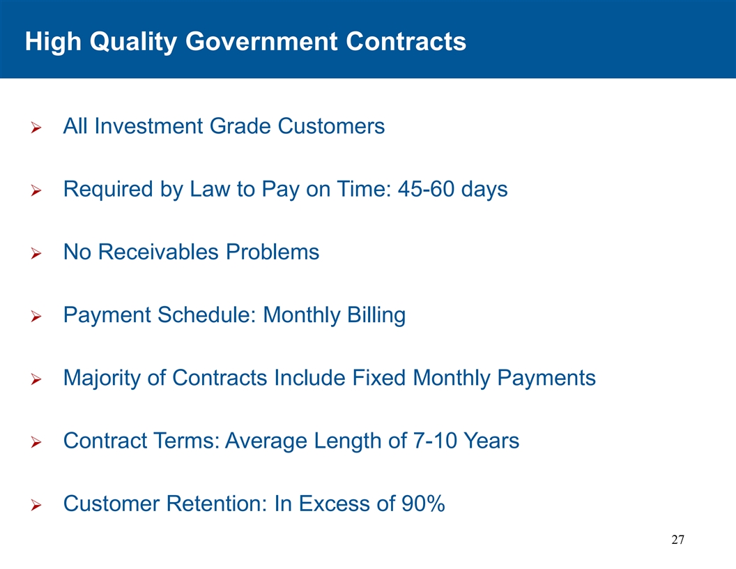 优质政府合同Ø所有投资级客户Ø依法要求按时付款:45-60天Ø无应收款问题Ø付款时间表:按月计费Ø大部分合同包含每月固定付款Ø合同条款:平均长度7-10年Ø客户保留率:超过90% 27