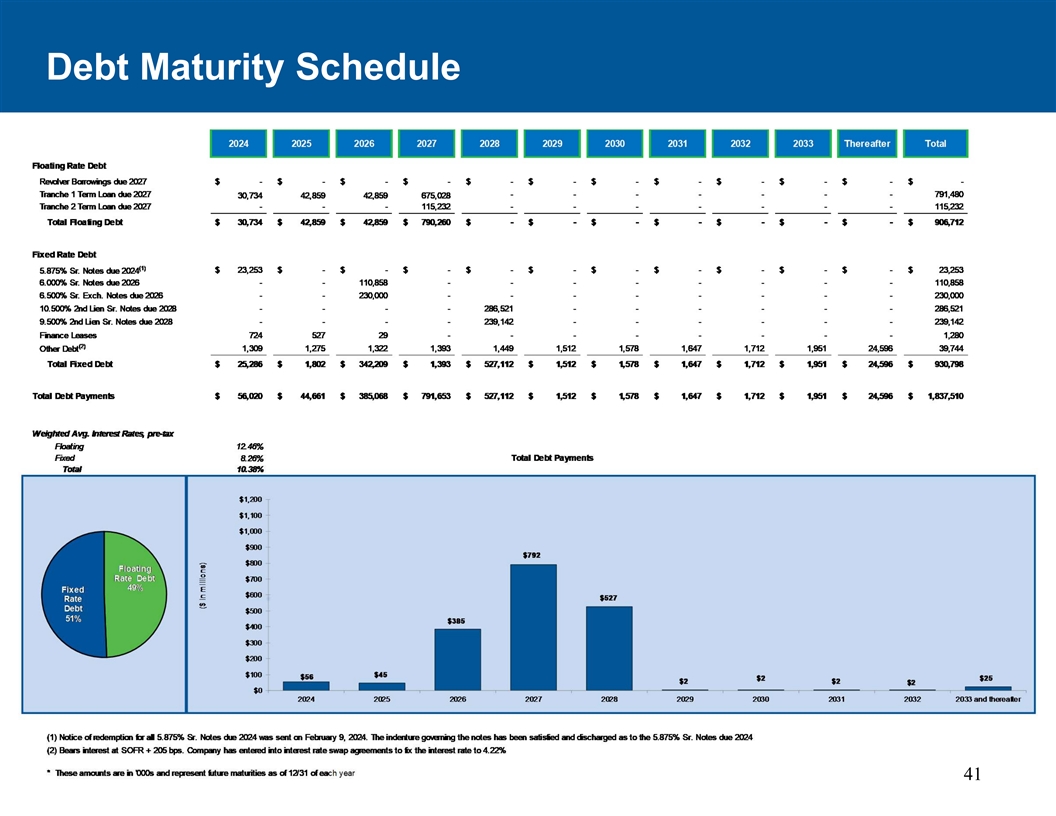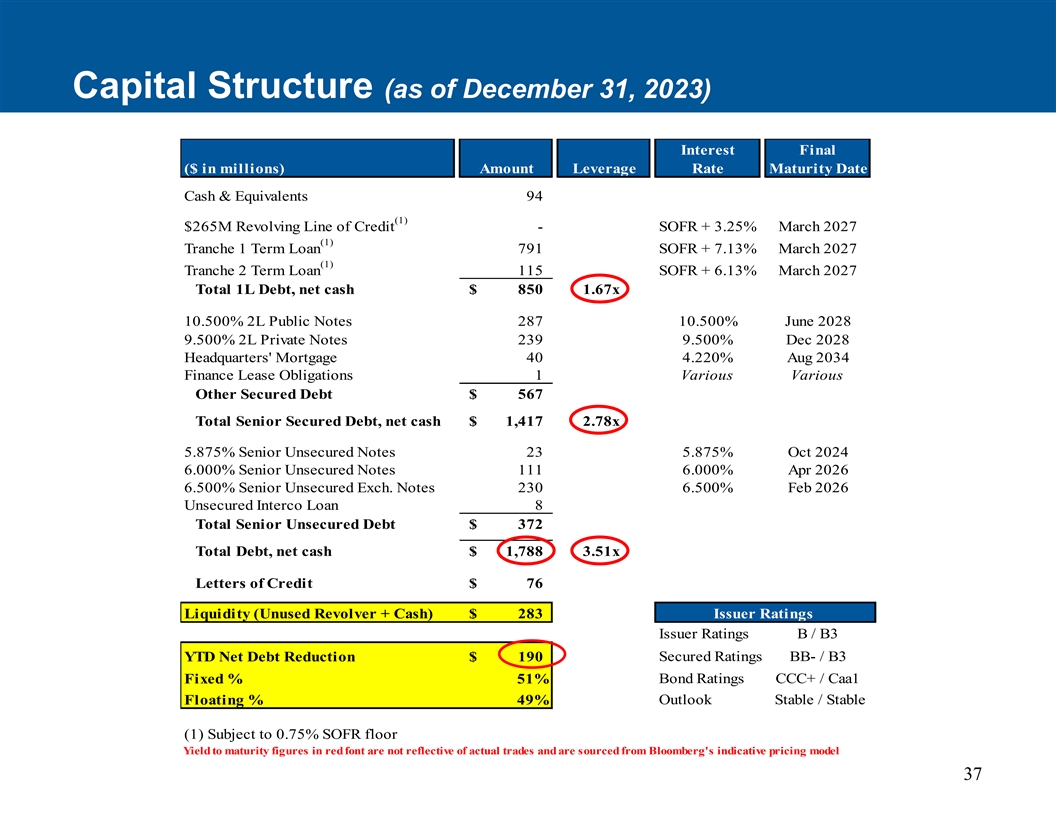 资本Structure(截至2023年12月31日)末期利息(百万美元)金额杠杆率到期日现金及等价物94(1)2.65亿美元循环信贷额度-SOFR + 3.25% 2027年3月(1)第1期定期贷款791 SOFR + 7.13% 2027年3月(1)第2期定期贷款115 SOFR + 6.13% 2027年3月1L债务总额,净现金$ 8501.67x 10.500% 2L公开票据28710.500% 2028年6月9.500% 2L私人票据2399.500% 2028年12月总部抵押贷款404.220% 2034年8月融资租赁义务1各种其他有担保债务$ 567高级有担保债务总额,净现金$ 1,417 2.78x 5.875%高级无担保票据235.875% 2024年10月6.000%高级无担保票据1116.000% 2026年4月6.500%高级无担保Exch。票据2306.500% 2026年2月无担保同业贷款8高级无担保债务总额372美元总债务,净现金1788美元3.51x信用证76美元流动性(未使用的左轮手枪+现金)283美元发行人评级发行人评级B/B3年初至今净债务减少190美元有担保评级BB-/B3固定% 51%债券评级CCC +/Caa1展望稳定/稳定浮动% 49%(1)受0.75% SOFR下限到期收益率红色字体数字不反映实际交易,来源于彭博指示性定价模型37
