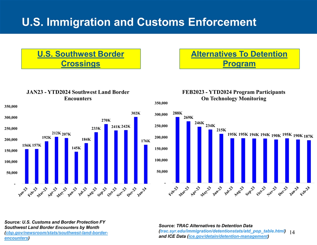 美国移民和海关执法联邦分部美国西南边境替代拘留再入过境点计划服务1月23日-YTD2024西南陆地边境FEB2023-YTD2024计划参与者遇到技术监测350,000350,000302K 288K 300,000300,000269K 270K 246K 234K 250,000242K 241K 250,000233K 215K 212K 207K 195K 195K 195K 194K 194K 190K 190K 187K 200000 192K 184K 200000 176K 156K 157K 145K 150,000150,000150,000100,000100,00050,00050,00050,000--来源:美国海关和边境保护局FY来源:TRAC替代拘留数据西南陆地边境按月遭遇(trac.syr.edu/immigration/detention和ICE数据(ice.gov/detain/detention-management)遭遇)