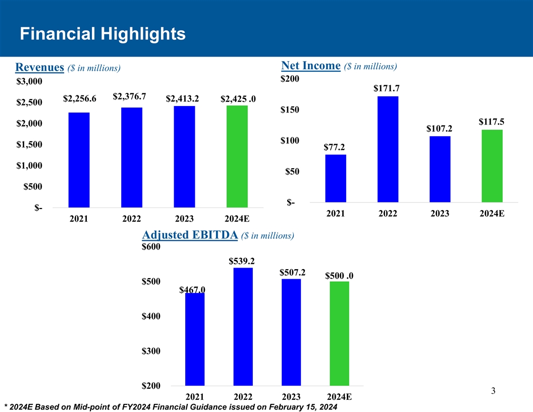 财务摘要净收入(百万美元)收入(百万美元)200美元3,000美元171.7美元2,376.7美元2,256.6美元2,413.2美元2,425.0美元2,500美元150美元117.5美元2,000美元107.2美元100美元1,500美元77.2美元1,000美元50美元500美元--2021202220232024E2021202220232024E调整后EBITDA(百万美元)600美元539.2美元507.2美元500.0美元500美元467.0美元400美元300美元20032021202220232024E * 2024E基于2024年2月15日发布的2024财年财务指引中点