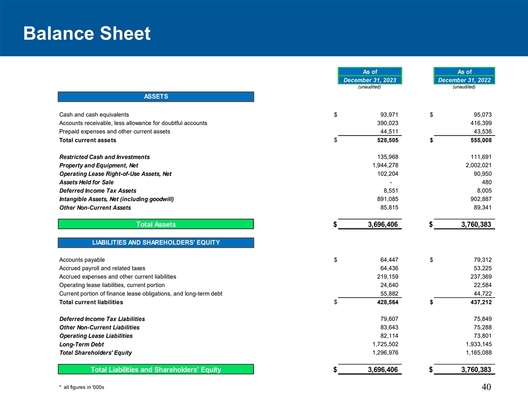 资产负债表截至2023年12月31日2022年12月31日(未经审计)(未经审计)资产现金和现金等价物93,971美元95,073美元应收账款,减呆账准备390,023416,399预付费用和其他流动资产44,51143,536流动资产总额528,505美元555,008135,968111,691受限制现金和投资财产和设备净额1,944,2782,002,021经营租赁使用权资产净额102,20490,950-480持有待售资产递延所得税资产8,5518,005无形资产,净额(含商誉)891,085902,88785,81589,341其他非流动资产总资产3,696,406美元3,760,383美元负债和股东权益应付账款64,447美元79,312美元应计工资和相关税费64,43653,225应计费用和其他流动负债219,159237,369经营租赁负债,流动部分24,64022,584融资租赁债务的流动部分,和长期债务55,88244,722流动负债总额$ 428,564 $ 437,21279,60775,849递延所得税负债其他非流动负债83,64375,288经营租赁负债82,11473,8011,725,5021,933,145长期债务股东权益总额1,296,9761,165,088负债和股东权益总额$ 3,696,406 $ 3,760,383 *所有数字在' 000s 40