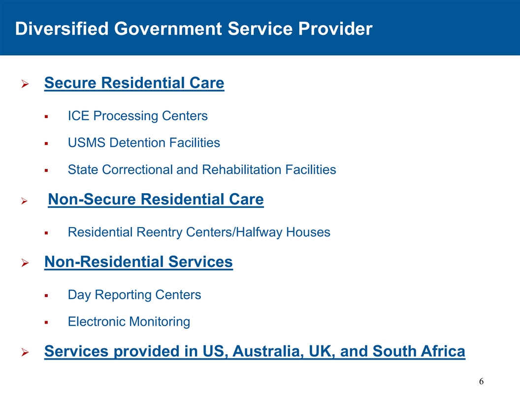 多元化政府服务提供商Ø安全的住院护理§ ICE处理中心§ USMS拘留设施§州惩教和康复设施Ø非安全的住院护理§住院再入中心/中途宿舍Ø非住院服务§日间报告中心§电子监控Ø在美国、澳大利亚、英国和南非提供的服务6