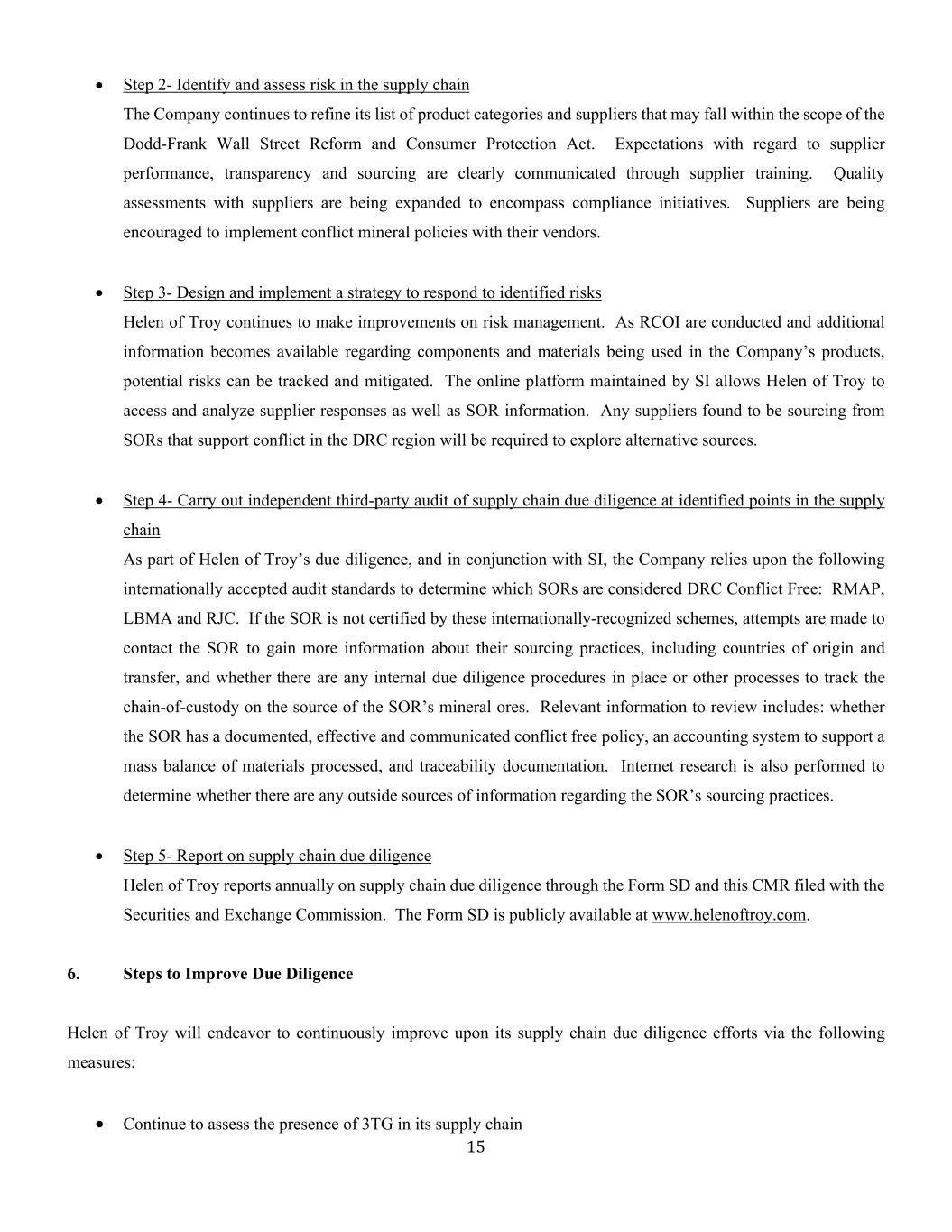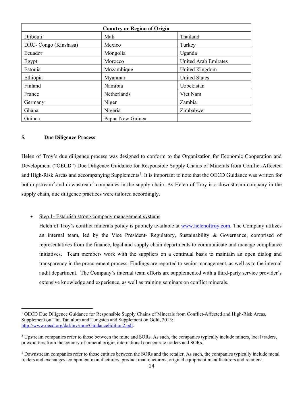 14原籍国或地区吉布提马里泰国DRC-刚果(金)墨西哥土耳其厄瓜多尔蒙古乌干达埃及摩洛哥阿拉伯联合酋长国爱沙尼亚莫桑比克英国埃塞俄比亚缅甸美国芬兰纳米比亚乌兹别克斯坦法国荷兰越南德国尼日尔赞比亚加纳尼日利亚津巴布韦几内亚巴布亚新几内亚5。尽职调查流程海伦特洛伊家电的尽职调查流程旨在符合经济合作与发展组织(“OECD”)关于来自受冲突影响地区和高风险地区的Minerals负责任供应链及随附补充剂的尽职调查指南1。值得注意的是,OECD指南是为供应链中的上游2和下游3公司编写的。由于toy的海伦特洛伊家电是一家供应链下游公司,因此相应地量身定制了尽职调查实践。•步骤1-建立强有力的公司管理制度海伦特洛伊家电的冲突矿产政策可在www.helenoftroy.com上公开查阅。该公司利用由副总裁领导的内部团队——监管、可持续发展和治理,由财务、法律和供应链部门的代表组成,负责沟通和管理合规举措。团队成员与供应商持续合作,以保持采购过程的公开对话和透明度。调查结果将报告给高级管理层,以及内部审计部门。公司内部团队的努力得到了第三方服务提供商的广泛知识和经验的补充,并举办了关于冲突矿物的培训研讨会。1 OECD对来自受冲突影响地区和高风险区的Minerals负责任供应链的尽职调查指南,关于锡、钽和钨的补充和关于黄金的补充,2013年;http://www.oecd.org/daf/inv/mne/GuidanceEdition2.pdf。2上游企业指矿山与SOR之间的企业。因此,这些公司通常包括矿商、当地贸易商或来自矿产来源国的出口商、国际精矿贸易商和SOR。3下游企业指的是SOR和零售商之间的那些实体。因此,这些公司通常包括金属贸易商和交易所、组件制造商、产品制造商、原始设备制造商和零售商。