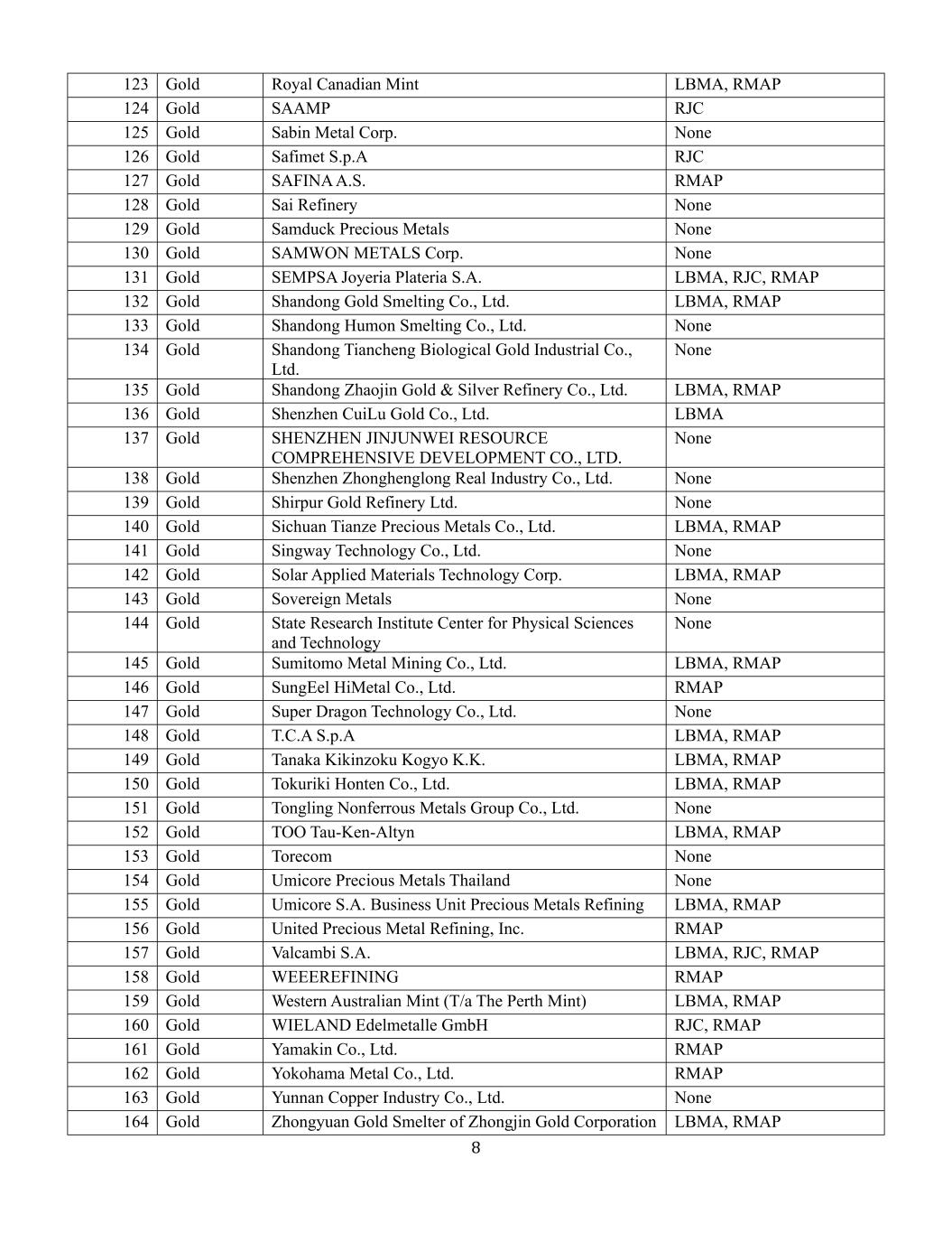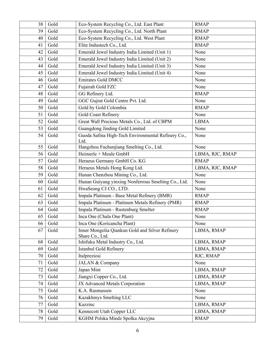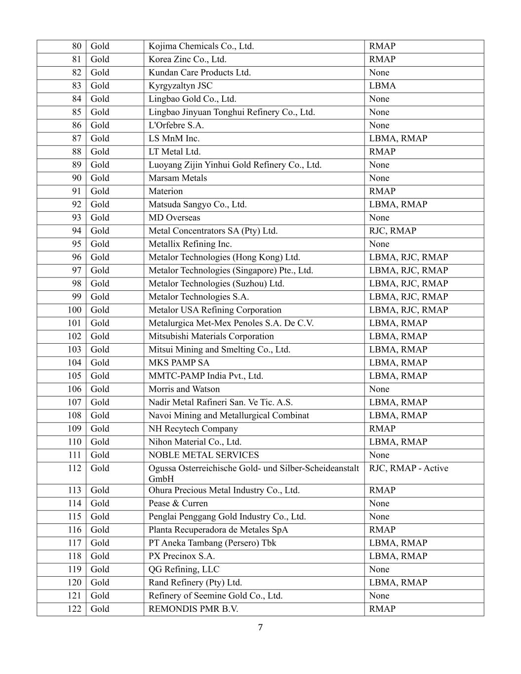 780 Gold Kojima Chemicals Co.,Ltd. RMAP 81 Gold Korea Zinc Co.,Ltd. RMAP 82 Gold Kundan Care Products Ltd. none 83 Gold Kyrgyzaltyn JSC LBMA 84 Gold Lingbao Gold Co.,Ltd. none 85 Gold Lingbao Jinyuan Tonghui Refinery Co.,Ltd. none 86 Gold L'Orfebre S.A. none 87 Gold LS MNM Inc. LBMA,RMAP 88 Gold LT Metal Ltd. RMAP 89 Gold Luoyang Zhijin Yinhui Gold Refinery Co.,Ltd. none 90 Gold Marsam Metals none 91 Gold Materion 丨Materion RMAP 92 Gold Matsuda Sangyo Co.,LtdRMAP 93 Gold MD Overseas none 94 Gold Metal Concentrators SA(Pty)Ltd. RJC,RMAP 95 Gold Metallix Refining Inc. none 96 Gold Metalor Technologies(Hong Kong)Ltd. LBMA,RJC,RMAP 97 Gold Metalor Technologies(Singapore)Pte.,Ltd. LBMA,RJC,RMAP 98 Gold Metalor Technologies(Suzhou)Ltd. LBMA,RJC,RMAP 99 Gold Metalor Technologies S.A. LBMA,RJC,RMAP 100 Gold Metalor USA Refining Corporation LBMA,RJC,RMAP 101 Gold Metalurgica Met-Mex Penoles S.A. de C.V. LBMA,RMAP 102 Gold MitsubishiRMAP 104 Gold MKS PAMP SA LBMA,RMAP 105 Gold MMTC-PAMP India Pvt.,Ltd. LBMA,RMAP 106 Gold Morris and Watson None 107 Gold Nadir Metal Rafineri San。Ve Tic。A.S. LBMA,RMAP 108 Gold Navoi Mining and Metallurgical Combinat LBMA,RMAP 109 Gold NH Recytech Company RMAP 110 Gold Nihon Material Co.,Ltd. LBMA,RMAP 111 Gold Noble Metal Services none 112 Gold Ogussa Osterreichische Gold-und Silber-Scheideanstalt GmbH RJC,RMAP-Active 113 Gold Ohura Precious Metal Industry Co.,Ltd. RMAP 114 Gold Pease & Curren none 115 Gold Penglai Penggang Gold Industry Co.,Ltd. none 116 Gold Planta Recuperadora de Metales SpA RMAP 117 Gold PT Aneka Tambang(Persero)Tbk LLLC none 120 Gold Rand Refinery(Pty)Ltd. LBMA,RMAP 121 Gold Refinery of Seemine Gold Co.,Ltd. none 122 Gold REMONDIS PMR B.V. RMAP