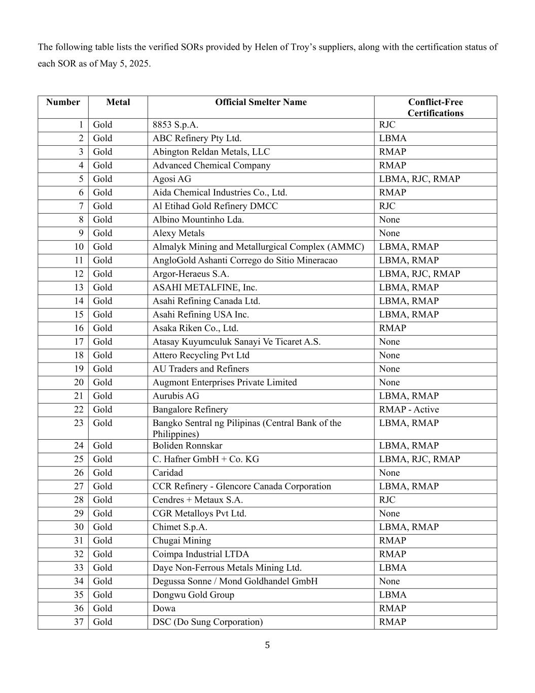 5下表列出了经验证的由海伦特洛伊家电的供应商提供的SOR,以及截至2025年5月5日各SOR的认证情况。Number Metal Official Smelter Name Conflict-Free Certifications 1 Gold 8853 S.P.A. RJC 2 Gold ABC Refinery Pty Ltd. LBMA 3 Gold Abington Reldan Metals,LLC RMAP 4 Gold Advanced Chemical Company RMAP 5 Gold Agosi AG LBMA,RJC,RMAP 6 Gold Aida Chemical Industries Co.,Ltd. RMAP 7 Gold Al Etihad Gold Refinery DMCC RJC 8 Gold Albino Mountinho Lda。无9黄金Alexy Metals无10黄金Almalyk Mining and Metallurgical Complex(AMMC)LBMA,RMAP 11黄金AngloGold Ashanti Corrego do Sitio Mineracao LBMA,RMAP 12黄金Argor-Heraeus S.A. LBMA,RJC,RMAP 13黄金ASAHI METALFINE,Inc. LBMA,RMAP 14黄金Asahi Refining Canada Ltd. LBMA,RMAP 15黄金Asahi Refining USA Inc. LBMA,RMAP 16黄金Asaka Riken Co.,Ltd. RMAP 17黄金Atasay Kuyumculuk Sanayi Ve Ticaret A.S. none 18黄金Attero Recycling PVT Ltd none 19RMAP 22 Gold Bangalore Refinery RMAP-Active 23 Gold Bangko Sentral ng Pilipinas(菲律宾中央银行)LBMA,RMAP 24 Gold Boliden Ronnskar LBMA,RMAP 25 Gold C. Hafner GmbH + Co. KG LBMA,RJC,RMAP 26 Gold Caridad none 27 Gold CCR Refinery-Glencore Canada Corporation LBMA,RMAP 28 Gold Cendres + Metaux S.A. RJC 29 Gold CGR Metalloys PVT Ltd. none 30 Gold Chimet S.p.A. LBMA,RMAP 31 Gold Chugai Mining RMAP 32 Gold Coimpa Industrial LTDA RMAP 33 Gold Daye Nonferrous Metals Mining Ltd. LBMA 34 Gold Degussa Sonne/Mond Goldhandel GmbH none 35 Gold Dongwu Gold Group LBMA 36 Gold Dowa RMAP 37 Gold DSC(Do Sung Corporation)RMAP