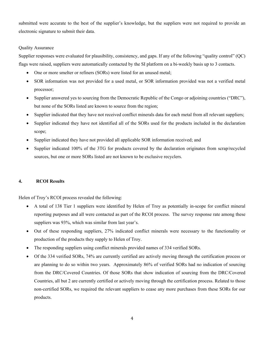 所提交的4份据供应商所知是准确的,但供应商没有被要求提供电子签名以提交其数据。对质量保证供应商回复的合理性、一致性和差距进行了评估。如果出现以下任何一种“质量控制”(QC)标志,SI平台将自动按双周联系供应商,最多可联系3个联系人。•一家或多家冶炼厂或精炼商(SOR)因一种未使用的金属而被列入名单;•未为一种使用过的金属提供SOR信息,或提供的SOR信息不是经过验证的金属加工商;•供应商对从刚果民主共和国或毗邻国家(“DRC”)采购的回答是,但已知没有一种所列SOR的来源来自该区域;•供应商表示,他们没有从所有相关供应商那里收到每种金属的冲突矿物数据;•供应商表示,他们没有确定列入申报范围的产品所使用的所有SOR;•供应商表示,他们没有提供所收到的所有适用的SOR信息;•供应商表示,申报所涵盖产品的3TG 100%来自废料/回收来源,但所列的一种或多种SOR并不知道是独家回收者。4.RCOI结果海伦特洛伊家电的RCOI流程揭示了以下内容:•共有138家一级供应商被海伦特洛伊家电确定为可能具有冲突矿物报告目的的范围,并且作为RCOI流程的一部分,所有这些供应商都进行了接触。这些供应商中的调查回复率为93%,与去年相仿。•在这些作出答复的供应商中,27%的供应商表示冲突矿物对其供应给海伦特洛伊家电的产品的功能或生产是必要的。•使用冲突矿物的答复供应商提供了334个经核实的SOR的名称。•在334个经过验证的SOR中,74%目前正在积极通过认证程序或计划在两年内这样做。约86%的已核实SOR没有来自刚果民主共和国/涵盖国家的迹象。在那些显示有来源刚果民主共和国/涵盖国家的迹象的SOR中,除2个外,所有SOR目前都已获得认证或正在积极通过认证程序。与那些未经认证的SOR相关,我们要求相关供应商停止从这些SOR为我们的产品进行任何更多的采购。