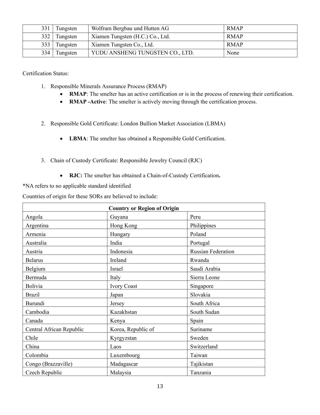 13331钨Wolfram Bergbau und Hutten AG RMAP 332钨厦门钨业(H.C.)有限公司RMAP 333钨厦门钨业有限公司RMAP 334钨玉都安盛钨业有限公司。无认证状态:1。负责任的Minerals保证流程(RMAP)• RMAP:冶炼厂拥有活跃的认证或正在更新其认证过程中。• RMAP-Active:冶炼厂正积极通过认证程序。2.责任金证:伦敦金银市场协会(LBMA)• LBMA:冶炼厂已获得责任金证。3.监管链证书:责任珠宝委员会(RJC)• RJC:冶炼厂已获得监管链认证。*NA指没有适用标准确定这些SOR的原产国据信包括:原产国或地区安哥拉圭亚那秘鲁阿根廷香港菲律宾亚美尼亚匈牙利波兰澳大利亚印度葡萄牙奥地利印度尼西亚俄罗斯联邦白俄罗斯爱尔兰卢旺达比利时以色列沙特阿拉伯百慕大意大利塞拉利昂玻利维亚科特迪瓦新加坡巴西日本斯洛伐克布隆迪泽西岛南非柬埔寨哈萨克斯坦南苏丹加拿大肯尼亚西班牙中非共和国韩国、苏里南共和国智利吉尔吉斯斯坦瑞典中国老挝瑞士哥伦比亚卢森堡台湾刚果(布)马达加斯加塔吉克斯坦捷克共和国马来西亚坦桑尼亚