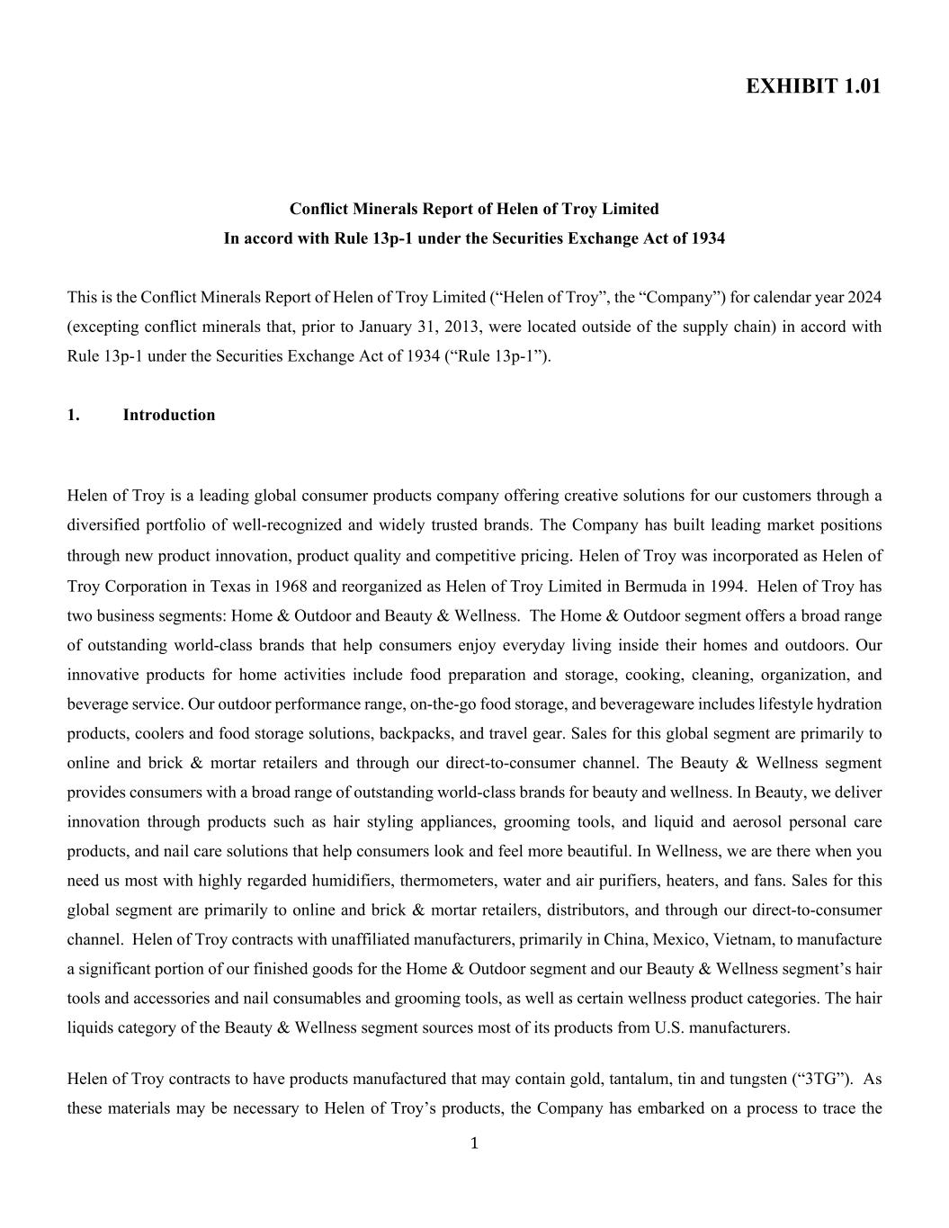1 ExHIBIT 1.01 海伦特洛伊家电有限公司根据1934年证券交易法规则13p-1提交的冲突Minerals报告这是海伦特洛伊家电有限公司(“海伦特洛伊家电”,“公司”)根据1934年证券交易法规则13p-1提交的2024日历年的冲突Minerals报告(2013年1月31日之前位于供应链之外的冲突矿物除外)(“规则13p-1”)。1.简介海伦特洛伊家电是一家全球领先的消费品公司,通过广泛认可和广泛信任的品牌的多元化组合,为我们的客户提供创造性的解决方案。公司通过新产品创新、产品质量和有竞争力的定价,打造了领先的市场地位。海伦特洛伊家电于1968年在德克萨斯州以海伦特洛伊家电公司的名义注册成立,并于1994年在百慕大重组为海伦特洛伊家电有限公司。troy的海伦特洛伊家电有两个业务部门:家居与户外和美容与健康。Home & Outdoor细分市场提供范围广泛的卓越世界级品牌,帮助消费者在家中和户外享受日常生活。我们的居家活动创新产品包括食物准备和储存、烹饪、清洁、组织、饮料服务。我们的户外性能系列、移动食品存储和饮料器具包括生活方式补水产品、冷却器和食品存储解决方案、背包和旅行装备。这一全球细分市场的销售主要面向在线和实体零售商,并通过我们的直接面向消费者的渠道。Beauty & Wellness部门为消费者提供范围广泛的卓越的世界级美容和健康品牌。在美容方面,我们通过头发造型器具、美容工具、液体和气雾剂个人护理产品等产品以及帮助消费者看起来和感觉更美的指甲护理解决方案提供创新。在Wellness,当您最需要我们时,我们就在那里,提供备受推崇的加湿器、温度计、水和空气净化器、加热器和风扇。这一全球细分市场的销售主要面向在线和实体零售商、分销商,并通过我们的直接面向消费者的渠道。特洛伊的海伦特洛伊家电与主要在中国、墨西哥、越南的非关联制造商签订合同,为我们的家居和户外部门以及美容与健康部门的毛发工具和配件、指甲耗材和美容工具以及某些健康产品类别制造很大一部分成品。Beauty & Wellness部门的发液类别的大部分产品来自美国制造商。特洛伊的海伦特洛伊家电签约生产的产品可能含有金、钽、锡和钨(“3TG”)。由于这些材料可能是海伦特洛伊家电产品所必需的,该公司已着手追踪