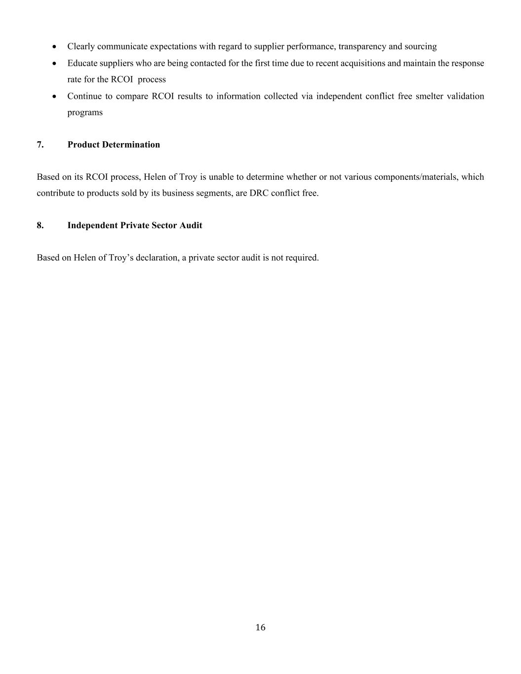 15 •第2步-识别和评估供应链中的风险公司继续完善可能属于《多德-弗兰克华尔街改革和消费者保护法》范围的产品类别和供应商清单。对供应商绩效、透明度和采购的期望通过供应商培训明确传达。与供应商的质量评估正在扩大,以涵盖合规举措。正在鼓励供应商与其供应商执行冲突矿产政策。•第三步-设计并实施应对已识别风险的策略海伦特洛伊家电在风险管理上不断进行改进。随着RCOI的进行以及有关公司产品中使用的组件和材料的更多信息可用,可以跟踪和减轻潜在风险。SI维护的在线平台允许海伦特洛伊家电访问和分析供应商的回应以及SOR信息。任何被发现从支持刚果民主共和国地区冲突的SOR采购的供应商都将被要求探索替代来源。•步骤4-在供应链中已确定的点位对供应链尽职调查进行独立的第三方审计,作为海伦特洛伊家电尽职调查的一部分,公司与SI一起,依靠以下国际公认的审计标准来确定哪些SOR被视为刚果民主共和国没有冲突:RMAP、LBMA和RJC。如果SOR未获得这些国际公认计划的认证,我们将尝试与SOR联系,以获取有关其采购做法的更多信息,包括原产国和转让,以及是否有任何内部尽职调查程序或其他流程来跟踪关于SOR矿物矿石来源的监管链。需要审查的相关信息包括:SOR是否有记录、有效和沟通的无冲突政策,支持所处理材料的大规模平衡的会计制度,以及可追溯性文件。还会进行互联网调查以确定是否有任何外部来源的信息有关SOR的采购做法。•步骤5-供应链尽职调查报告海伦特洛伊家电每年通过表格SD和向美国证券交易委员会备案的这份CMR报告供应链尽职调查。表格SD可在www.helenoftroy.com上公开查阅。6.改善尽职调查的步骤海伦特洛伊家电将努力通过以下措施不断改进其供应链尽职调查工作:•继续评估3TG在其供应链中的存在