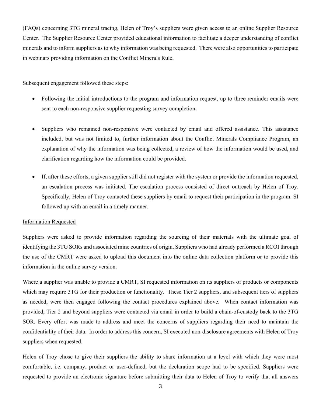 3(FAQ)涉及3TG矿物追踪,海伦特洛伊家电的供应商被允许访问在线供应商资源中心。供应商资源中心提供了教育信息,以促进更深入地了解冲突矿物,并告知供应商为何要求提供信息。还有机会参加网络研讨会,提供有关冲突Minerals规则的信息。随后的参与遵循了以下步骤:•在初步介绍该计划和信息请求之后,向每个没有回应的供应商发送了多达三封提醒电子邮件,要求完成调查。•通过电子邮件联系了仍未回复的供应商,并提供了帮助。这项援助包括但不限于提供有关冲突Minerals合规计划的进一步信息、解释收集信息的原因、审查如何使用这些信息以及澄清如何提供这些信息。•如果在这些努力之后,特定供应商仍然没有向系统注册或提供所要求的信息,则启动升级程序。升级过程包括由特洛伊的海伦特洛伊家电的TERM0直接外联。具体来说,海伦特洛伊家电通过电子邮件与这些供应商联系,要求他们参与该计划。SI及时跟进了一封邮件。要求提供的信息要求供应商提供有关其材料来源的信息,最终目标是确定3TG SOR和相关的地雷原产国。已通过使用CMRT执行RCOI的供应商被要求将此文件上传到在线数据收集平台或在在线调查版本中提供此信息。如果供应商无法提供CMRT,SI要求提供其产品或组件供应商的信息,这些产品或组件的生产或功能可能需要3TG。这些二级供应商,以及根据需要的后续一级供应商,随后按照上述联系程序进行了聘用。在提供联系信息时,会通过电子邮件联系Tier2及更高级别的供应商,以便建立一个回到3TG SOR的监管链。已尽一切努力解决和满足供应商对其数据保密需求的关切。为了解决这一问题,SI应要求与海伦特洛伊家电供应商执行了保密协议。特洛伊的海伦特洛伊家电选择让供应商能够在他们最满意的水平上共享信息,即公司、产品或用户定义的信息,但必须具体规定申报范围。供应商被要求在将其数据提交给海伦特洛伊家电以验证所有答案之前提供一个电子签名