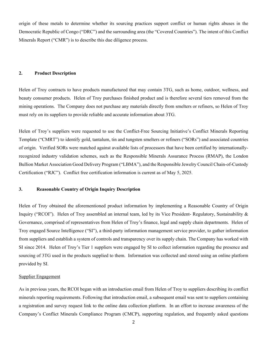 2这些金属的来源,以确定其采购做法是否支持刚果民主共和国(“刚果民主共和国”)和周边地区(“被覆盖国家”)的冲突或侵犯人权行为。这份冲突Minerals报告(“CMR”)的目的是描述这一尽职调查过程。2.产品描述海伦特洛伊家电签约生产可能含有3TG的产品,例如家居、户外、健康和美容消费品。Troy的海伦特洛伊家电购买成品,因此被排除在采矿业务之外的几级。该公司不直接从冶炼厂或精炼厂采购任何材料,因此海伦特洛伊家电的TERM0必须依赖其供应商提供有关3TG的可靠和准确的信息。要求海伦特洛伊家电的供应商使用无冲突采购倡议的冲突Minerals报告模板(“CMRT”)来识别黄金、钽、锡和钨的冶炼商或精炼商(“SOR”)以及相关的原产国。经过验证的SOR与已通过国际公认的行业验证计划认证的可用加工商名单相匹配,这些加工商已通过责任Minerals保证流程(RMAP)、伦敦金银市场协会良好交付计划(“LBMA”)和责任珠宝委员会监管链认证(“RJC”)等。无冲突认证信息截至2025年5月5日为最新信息。3.合理原产地查询说明海伦特洛伊家电通过实施合理原产地查询(“RCOI”)获得前述产品信息。特洛伊的海伦特洛伊家电组建了一个内部团队,由监管、可持续发展与治理领域的副总裁领衔,该团队由来自特洛伊金融、法律和供应链部门的代表组成。海伦特洛伊家电聘请了第三方信息管理服务提供商Source Intelligence(“SI”)从供应商处收集信息,并对其供应链建立控制和透明度系统。该公司自2014年以来一直与SI合作。SI委托海伦特洛伊家电的一级供应商收集有关向其供应的产品中使用的3TG的存在和来源的信息。信息是使用SI提供的在线平台收集和存储的。与往年一样,RCOI的供应商参与始于特洛伊的海伦特洛伊家电给供应商的一封介绍电子邮件,其中描述了其冲突矿物报告要求。在那封介绍电子邮件之后,随后向供应商发送了一封电子邮件,其中包含在线数据收集平台的注册和调查请求链接。为努力提高对公司冲突Minerals合规计划(CMCP)、配套监管、常见问题解答的认识