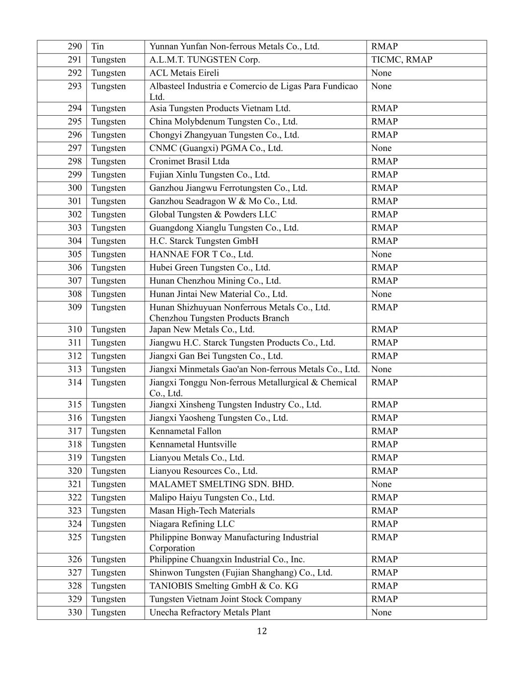 12290锡云南云帆有色金属股份有限公司RMAP 291钨A.L.M.T. TUNGSTEN Corp. TICMC,RMAP 292钨ACL Metais Eireli none 293钨Albasteel Industria e Comercio de Ligas Para Fundicao Ltd. none 294钨亚洲钨品越南有限公司RMAP 295钨中国钼钨股份有限公司RMAP 296钨崇义章源钨业有限公司RMAP 297钨中色(广西)PGMA有限公司none 298钨Cronimet Brasil Ltda RMAP 299钨福建新鹭钨业有限公司RMAP 300钨赣州江芜钨铁有限公司RMAP 301钨赣州海龙W & Mo有限公司,有限公司RMAP 302 Tungsten Global Tungsten & Powders LLC RMAP 303 Tungsten Guangdong Xianglu Tungsten Co.,Ltd. RMAP 304 Tungsten H.C. Starck Tungsten GmbH RMAP 305 Tungsten HANNAE for T Co.,Ltd. none 306 Tungsten Hubei Green Tungsten Co.,Ltd. RMAP 307 Tungsten湖南辰州矿业有限公司RMAP 308 Tungsten湖南锦泰新材料有限公司none 309 Tungsten湖南石竹园有色金属有限公司郴州钨品分公司RMAP 310 Tungsten Japan New Metals Co.,Ltd. RMAP 311 Tungsten Jiangwu H.C. Starck Tungsten Products Co.,Ltd. RMAP 312 TLtd. RMAP 313钨江西五矿高安有色金属有限公司无314钨江西铜鼓有色冶金化工有限公司RMAP 315钨江西鑫盛钨业有限公司RMAP 316钨江西耀盛钨业有限公司RMAP 317钨肯纳金属法隆RMAP 318钨肯纳金属亨茨维尔RMAP 319钨联友金属有限公司RMAP 320钨联友资源有限公司RMAP 321钨MALAMET熔炼SDN。BHD。无322钨麻栗坡海裕钨业有限公司RMAP 323钨麻山高科技材料RMAP 324钨Niagara Refining LLC RMAP 325钨菲律宾Bonway Manufacturing Industrial Corporation RMAP 326钨菲律宾创新工业有限公司RMAP 327钨新原钨业(福建上航)有限公司RMAP 328钨TANIOBIS Smelting GmbH & Co. KG RMAP 329钨越南股份公司RMAP 330钨Unecha难熔金属厂无