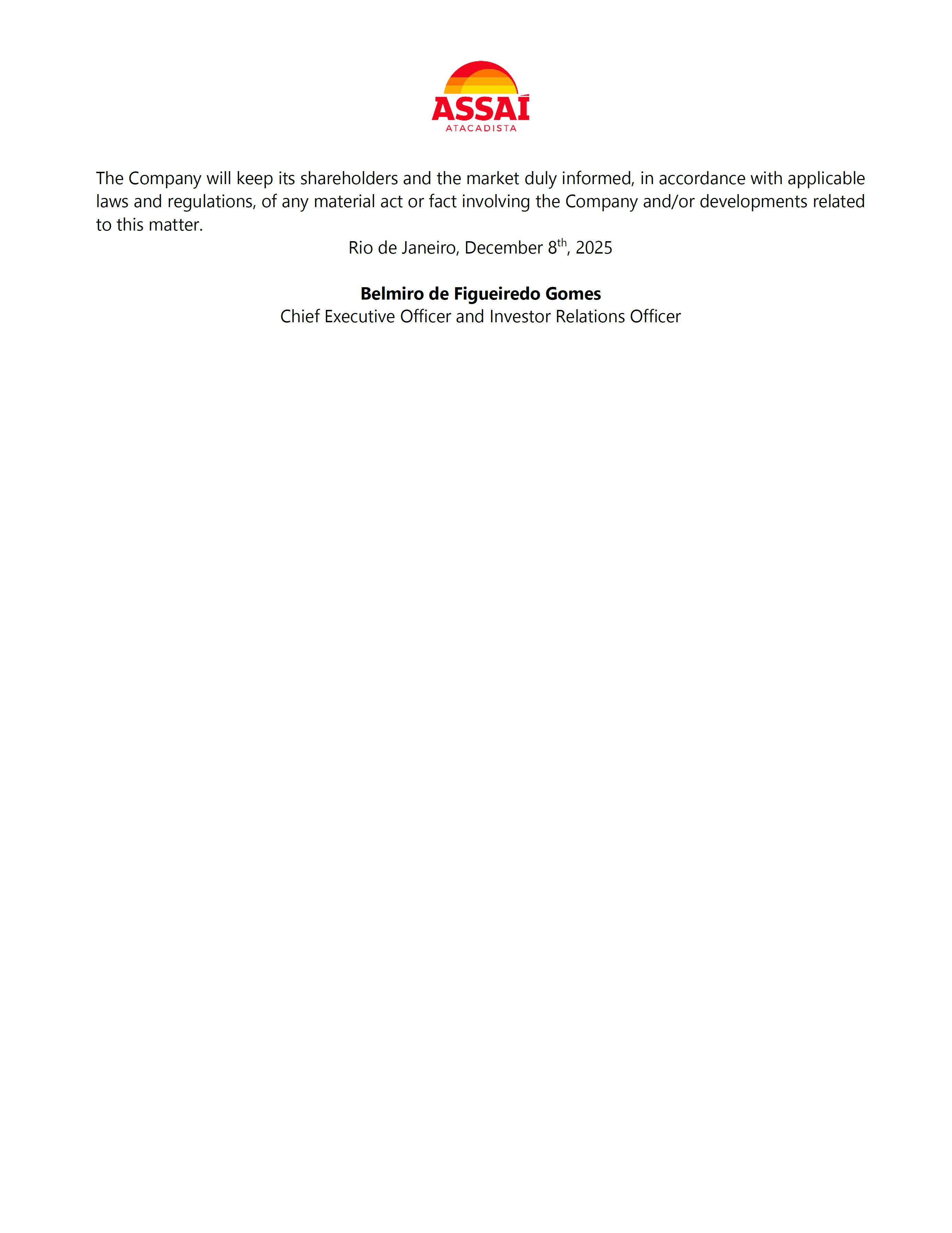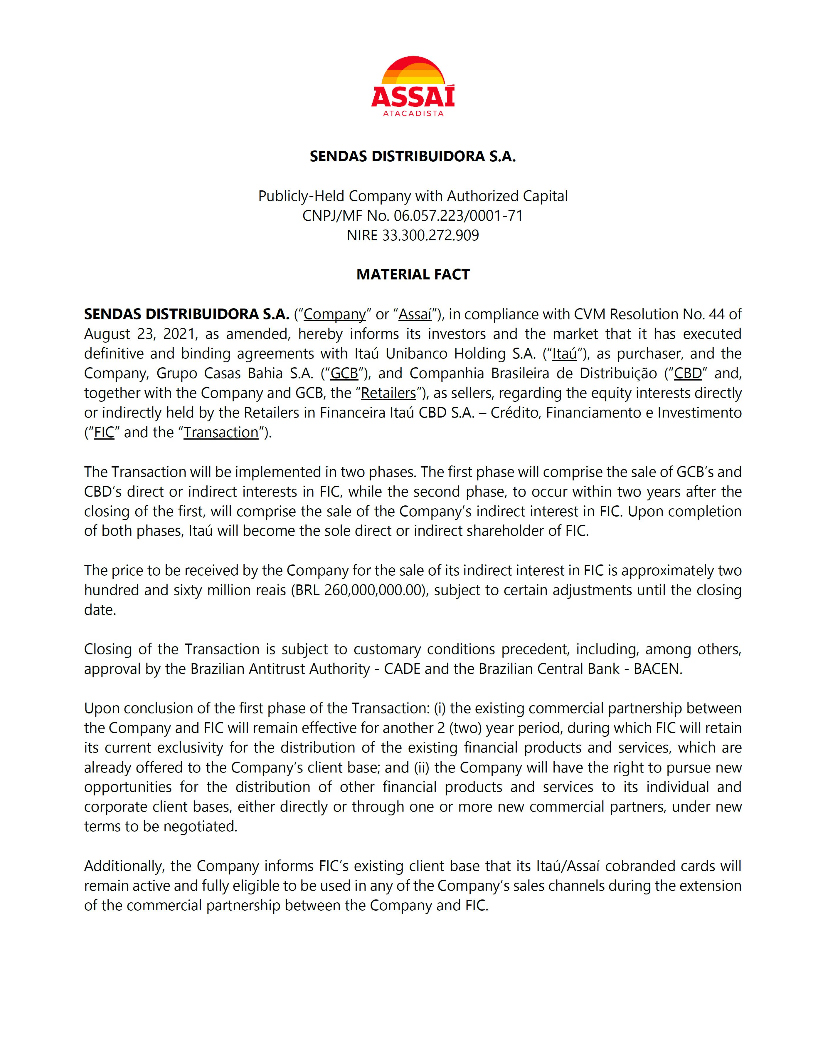 SENDAS DISTRIBUIDORA S.A.公众持股公司,授权资本CNPJ/MF编号06.057.223/0001-71NIRE 33.30 0.27 2.909MATERIAL FACTSENDAS DISTRIBUIDORA S.A.(“公司”或“Assa í”),根据经修订的2021年8月23日第44号决议,特此通知其投资者和市场,其已与Ita ú Unibanco Holding S.A.(“Ita ú”)(作为买方)以及公司、Grupo Casas Bahia S.A.(“GCB”)和Companhia Brasileira de Distribui çã o(“CBD”,以及与公司和GCB一起签署的“零售Financiamento e-Investimento(“FIC”和“交易”)。该交易将分两个阶段实施。第一阶段将包括出售GCB和CBD在FIC的直接或间接权益,而第二阶段将在第一阶段结束后的两年内发生,将包括出售公司在FIC的间接权益。两个阶段完成后,Ita ú将成为FIC的唯一直接或间接股东。公司出售其在FIC的间接权益将收到的价格约为2亿6千万雷亚尔(260,000,000.00巴西雷亚尔),但在截止日期之前可能会进行某些调整。交易的完成取决于惯例先决条件,其中包括,巴西反垄断局-CADEE和巴西中央银行-BACEN的批准。在第一阶段交易完成后:(i)公司与FIC之间的现有商业伙伴关系将再有效2(2)年,在此期间,FIC将保留其目前对现有金融产品和服务的分销的排他性,这些产品和服务已提供给公司的客户群;(ii)公司将有权寻求向其个人和公司客户群分销其他金融产品和服务的新机会,直接或通过一个或多个新的商业伙伴,根据新的条款进行谈判。此外,公司通知FIC的现有客户群,其Ita ú/Assa í联名卡将在公司与FIC的商业合作关系延期期间保持活跃并完全有资格在公司的任何销售渠道中使用。公司将根据适用的法律法规,随时向其股东和市场适当通报涉及公司的任何重大行为或事实和/或与此事项相关的发展。里约热内卢,12月8日,2025Belmiro de Figueiredo GMES首席执行官兼投资者关系官