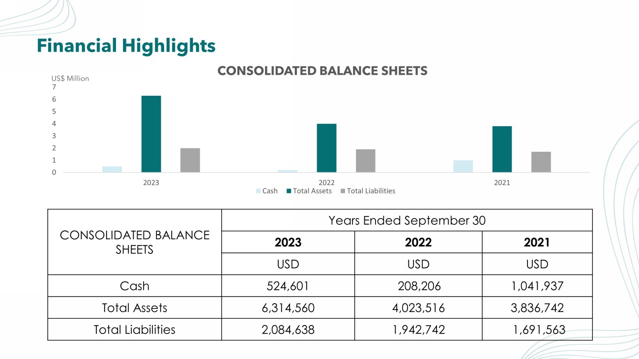 财务摘要合并资产负债表截至2023年9月30日止年度202320222021美元美元现金524,601208,2061,041,937总资产6,314,5604,023,5163,836,742总负债2,084,6381,942,7421,691,563百万美元01234567202320222021合并资产负债表现金总资产总负债
