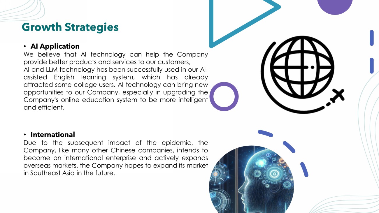 增长策略• AI应用我们相信AI技术可以帮助公司为我们的客户提供更好的产品和服务,AI和LLM技术已经成功应用在我们的AI辅助英语学习系统中,已经吸引了一些高校用户。AI技术可以为我们公司带来新的机遇,特别是在升级公司的在线教育系统方面,使其更加智能和高效。•国际由于后续受疫情影响,公司和其他很多中国企业一样,有意做国际化企业,积极拓展海外市场,公司未来希望拓展东南亚市场。
