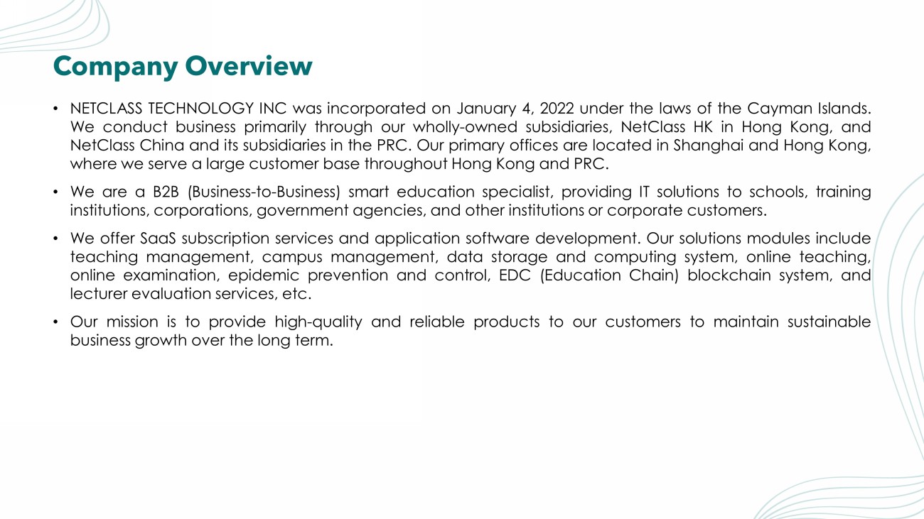 公司概况• NETCLASS TECHNOLOGY INC于2022年1月4日根据开曼群岛法律注册成立。我们主要透过我们的全资附属公司、香港的NetClass HK及中国的NetClass China及其附属公司开展业务。我们的主要办事处位于上海和香港,为遍布香港和中国的广大客户群提供服务。•我们是B2B(企业对企业)智慧教育专家,为学校、培训机构、企业、政府机构等机构或企业客户提供IT解决方案。•我们提供SaaS订阅服务和应用软件开发。我们的解决方案模块包括教学管理、校园管理、数据存储和计算系统、在线教学、在线考试、疫情防控、EDC(教育链)区块链系统、讲师评价服务等。•我们的使命是为我们的客户提供高质量和可靠的产品,以保持长期的可持续业务增长。