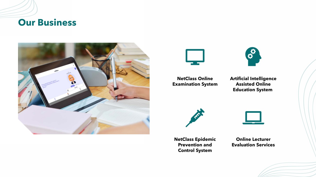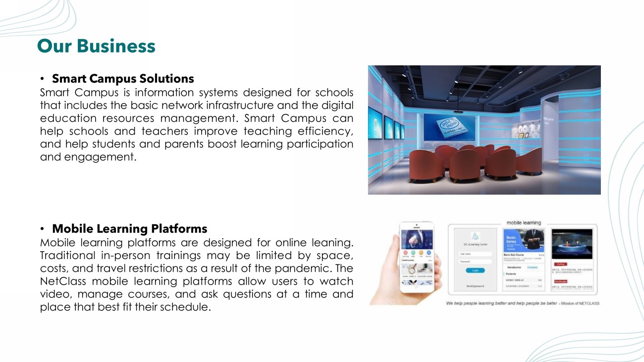 我们的业务•智慧校园解决方案智慧校园是为学校设计的包括基础网络基础设施和数字教育资源管理的信息系统。智慧校园可以帮助学校和教师提高教学效率,帮助学生和家长提升学习参与度和参与度。•移动学习平台M移动学习平台专为在线学习而设计。由于大流行,传统的面对面培训可能会受到空间、成本和旅行限制的限制。NetClass移动学习平台允许用户在最适合其日程安排的时间和地点观看视频、管理课程和提问。