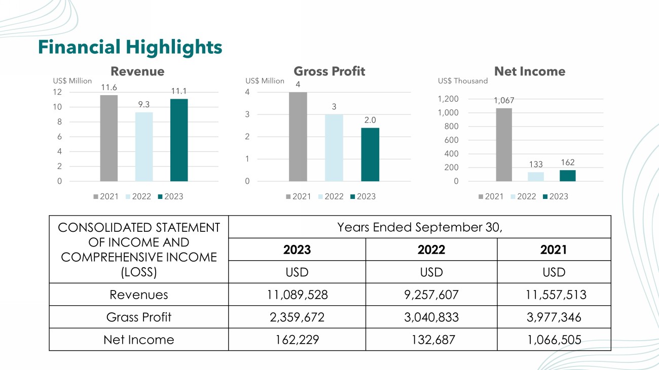 11.69.31 1.10 2468 1012收入2021202220231,06713316202004006008001,0001,200净收入202120222023432.00 1234毛利润202120222023百万美元百万美元千美元合并损益表和综合收益(亏损)截至2023年9月30日止年度20222021美元美元收入11,089,5289,257,60711,557,513草利润2,359,6723,040,8333,977,346净收入162,229132,6871,066,505财务摘要
