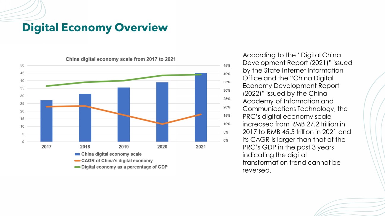数字经济概览•根据国家互联网信息办公室发布的《数字中国发展报告(2021)》和中国信息通信研究院发布的《中国数字经济发展报告(2022)》,中国的数字经济规模从2017年的人民币27.2万亿元增长到2021年的人民币45.5万亿元,其过去3年的复合年增长率大于中国GDP的复合年增长率,表明数字化转型趋势无法逆转。