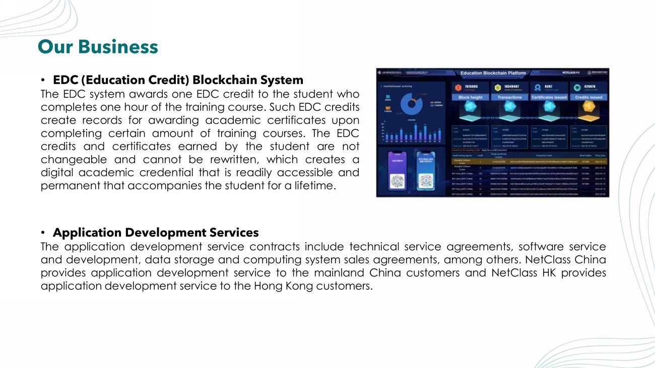 我们的业务• EDC(教育学分)区块链系统EDC系统向完成一小时培训课程的学生授予一个EDC学分。此类EDC学分在完成一定数量的培训课程后创建颁发学历证书的记录。学生获得的EDC学分和证书不可更改,不可重写,这就创造了一个易于访问和永久的数字学术证书,伴随学生一生。•应用开发服务应用开发服务合同包括技术服务协议、软件服务和开发、数据存储和计算系统销售协议等。网课中国向中国大陆客户提供应用程序开发服务,网课香港向香港客户提供应用程序开发服务。