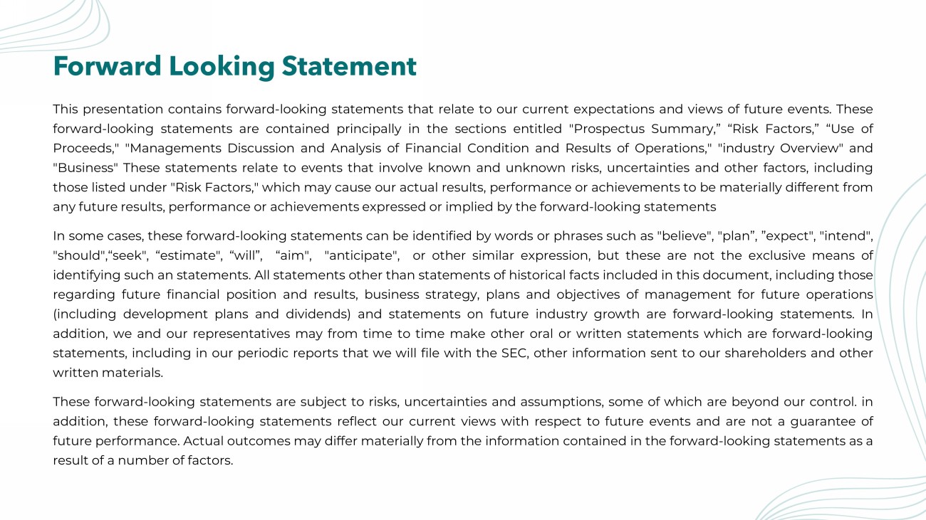 前瞻性陈述本演示文稿包含与我们当前的预期和对未来事件的看法相关的前瞻性陈述。这些前瞻性陈述主要包含在题为“招股说明书摘要”、“风险因素”、“所得款项用途”、“管理层对财务状况和经营成果的讨论和分析”、“行业概览”和“业务”的章节中。这些陈述涉及涉及已知和未知风险、不确定性和其他因素的事件,包括“风险因素”下所列的那些,这可能导致我们的实际结果、业绩或成就与前瞻性陈述明示或暗示的任何未来结果、业绩或成就存在重大差异在某些情况下,这些前瞻性陈述可以通过“相信”、“计划”、“预期”、“打算”、“应该”、“寻求”、“估计”、“将”、“目标”、“预期”等词语或短语或其他类似表达方式来识别,但这些并不是识别此类陈述的唯一方式。本文件中除历史事实陈述外的所有陈述,包括有关未来财务状况和结果、业务战略、管理层对未来运营的计划和目标(包括发展计划和股息)以及关于未来行业增长的陈述,均为前瞻性陈述。此外,我们和我们的代表可能会不时做出其他口头或书面陈述,这些陈述属于前瞻性陈述,包括在我们将向SEC提交的定期报告中、发送给我们股东的其他信息和其他书面材料中。这些前瞻性陈述受制于风险、不确定性和假设,其中一些超出我们的控制范围。此外,这些前瞻性陈述反映了我们目前对未来事件的看法,并不是对未来业绩的保证。由于多种因素,实际结果可能与前瞻性陈述中包含的信息存在重大差异。