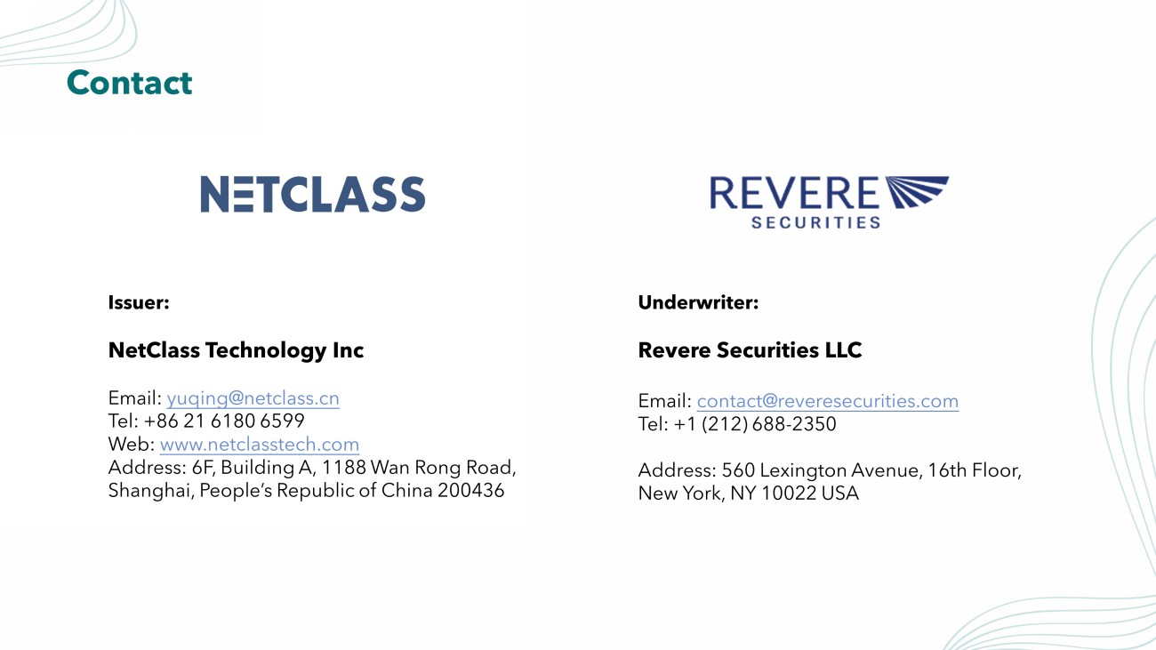 承销商:Revere Securities LLC邮箱:contact@reveresecurities.com电话:+ 1(212)688-2350地址:560 Lexington Avenue,16th Floor,New York,NY 10022 USA发行人:NetClass Technology Inc邮箱:yuqing@netclass.cn电话:+ 862161806599网页:www.netclasstech.com地址:中华人民共和国上海市万荣路1188号A座6F 200436联系方式