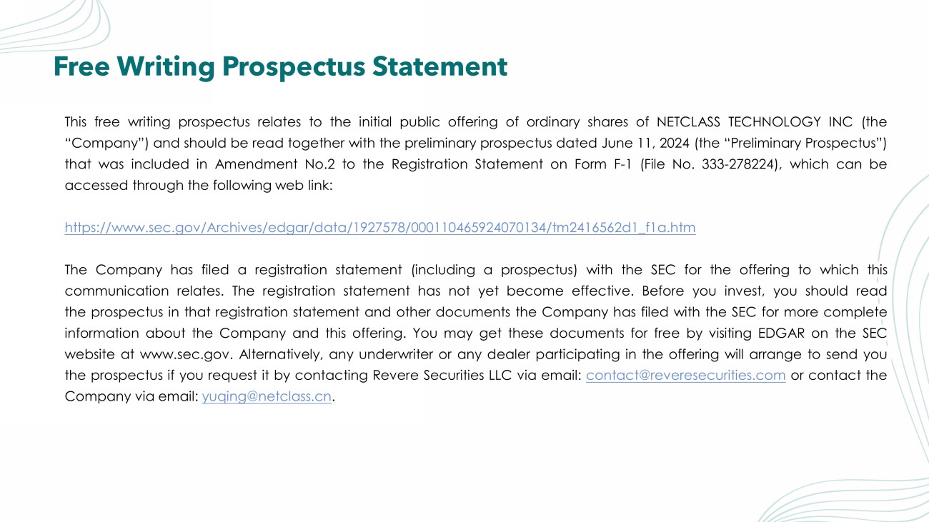 免费撰写招股章程声明本免费撰写招股章程涉及NETCLASS TECHNOLOGY INC(“公司”)首次公开发行普通股,应与日期为2024年6月11日的初步招股章程(“初步招股章程”)一并阅读,该初步招股章程已载入表格F-1(档案编号:333-278224)的注册声明第2号修订,可通过以下网页链接访问:https://www.sec.gov/archives/edgar/data/1927578/000110465924070134/tm2416562d1 _ f1 a.htm公司已就本通讯所涉及的发售向SEC提交了注册声明(包括招股说明书)。登记声明尚未生效。在您投资之前,您应该阅读该注册声明中的招股说明书以及公司向SEC提交的其他文件,以获得有关公司和此次发行的更完整信息。您可以通过访问SEC网站www.sec.gov上的EDGAR免费获得这些文件。或者,任何承销商或任何参与此次发行的交易商将安排向您发送招股说明书,如果您通过电子邮件联系Revere Securities LLC要求:contact@reveresecurities.com或通过电子邮件联系公司:yuqing@netclass.cn。