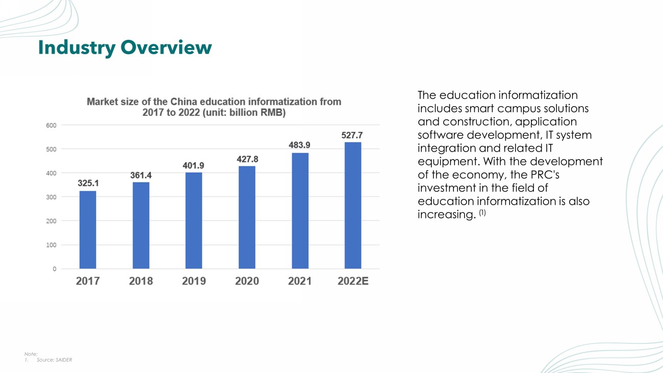 行业概览•电子教育信息化包括智慧校园解决方案与建设、应用软件开发、IT系统集成及相关IT设备。随着经济的发展,中国在教育信息化领域的投入也在不断增加。(一)注:1。来源:SAIDER